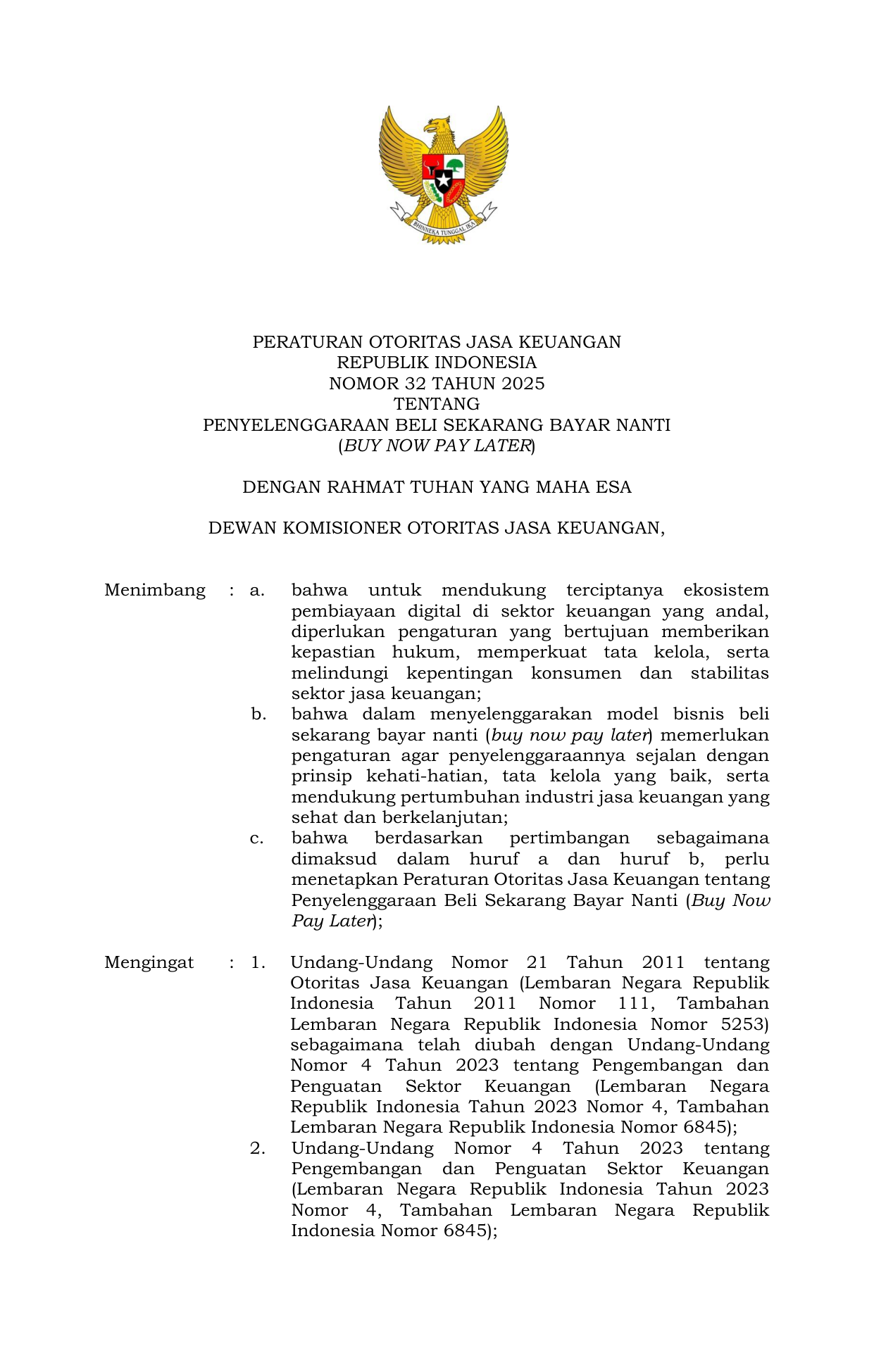 PERBAN Nomor 32 Tahun 2025 | Peraturan Badan Nomor 32 Tahun 2025 tentang Penyelenggaraan Beli Sekarang Bayar Nanti Buy Now Pay Later