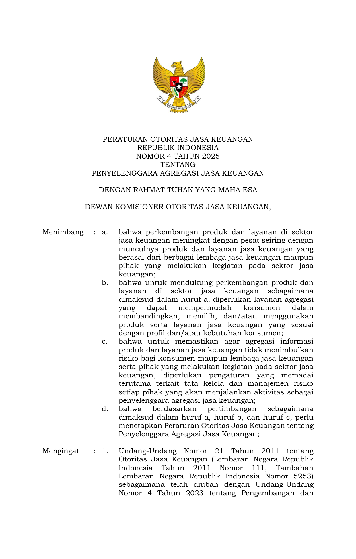 PERBAN Nomor 4 Tahun 2025 | Peraturan Badan Nomor 4 Tahun 2025 tentang Penyelenggara Agregasi Jasa Keuangan