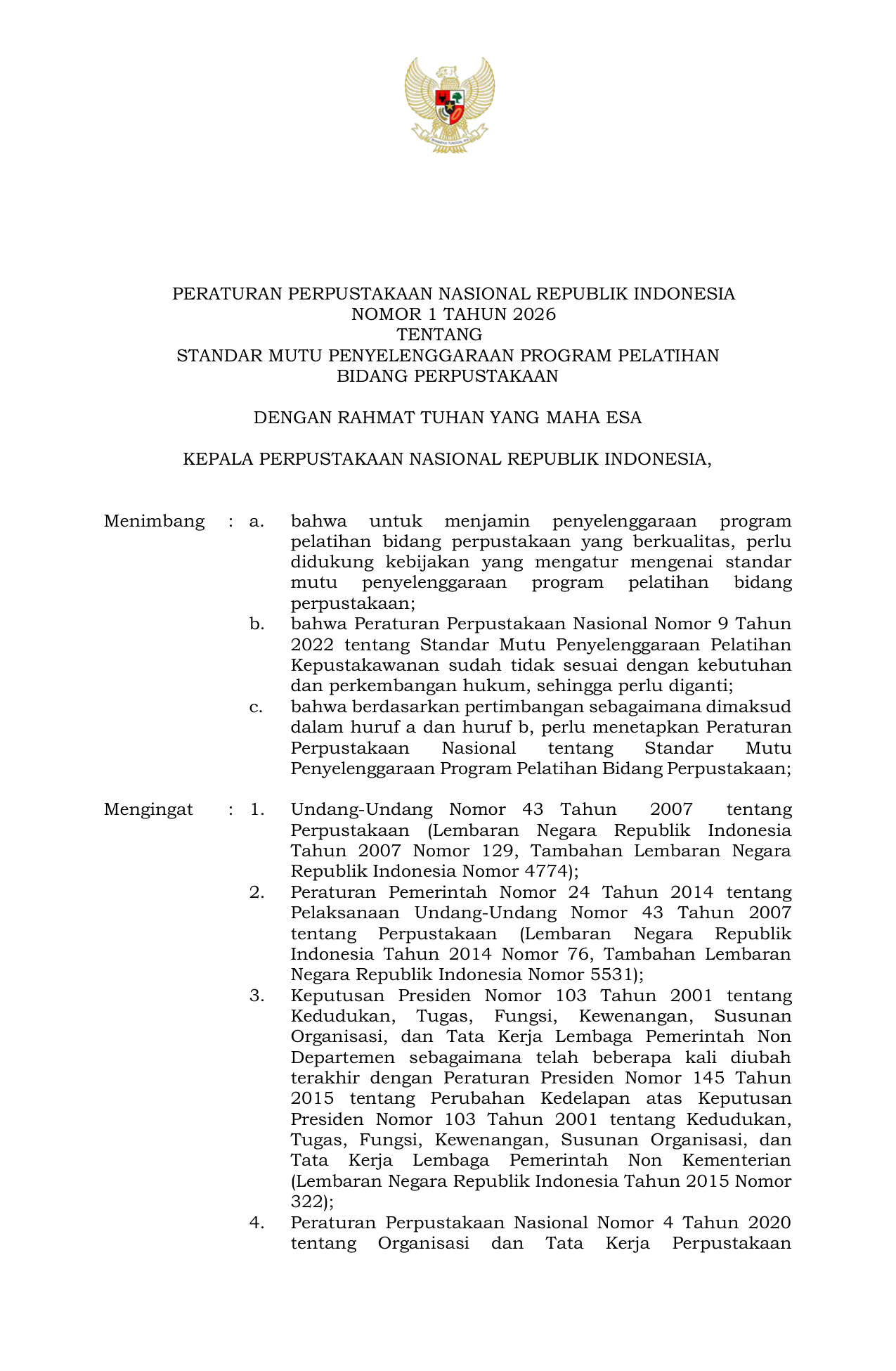 NOMOR 1 TAHUN 2026 TENTANG STANDAR MUTU PENYELENGGARAAN PROGRAM PELATIHAN BIDANG PERPUSTAKAAN