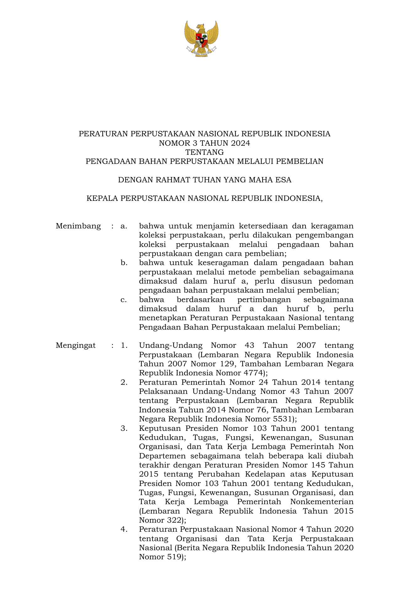 PERBAN Nomor 3 Tahun 2024 | Peraturan Badan Nomor 3 Tahun 2024 tentang Pengadaan Bahan Perpustakaan Melalui Pembelian