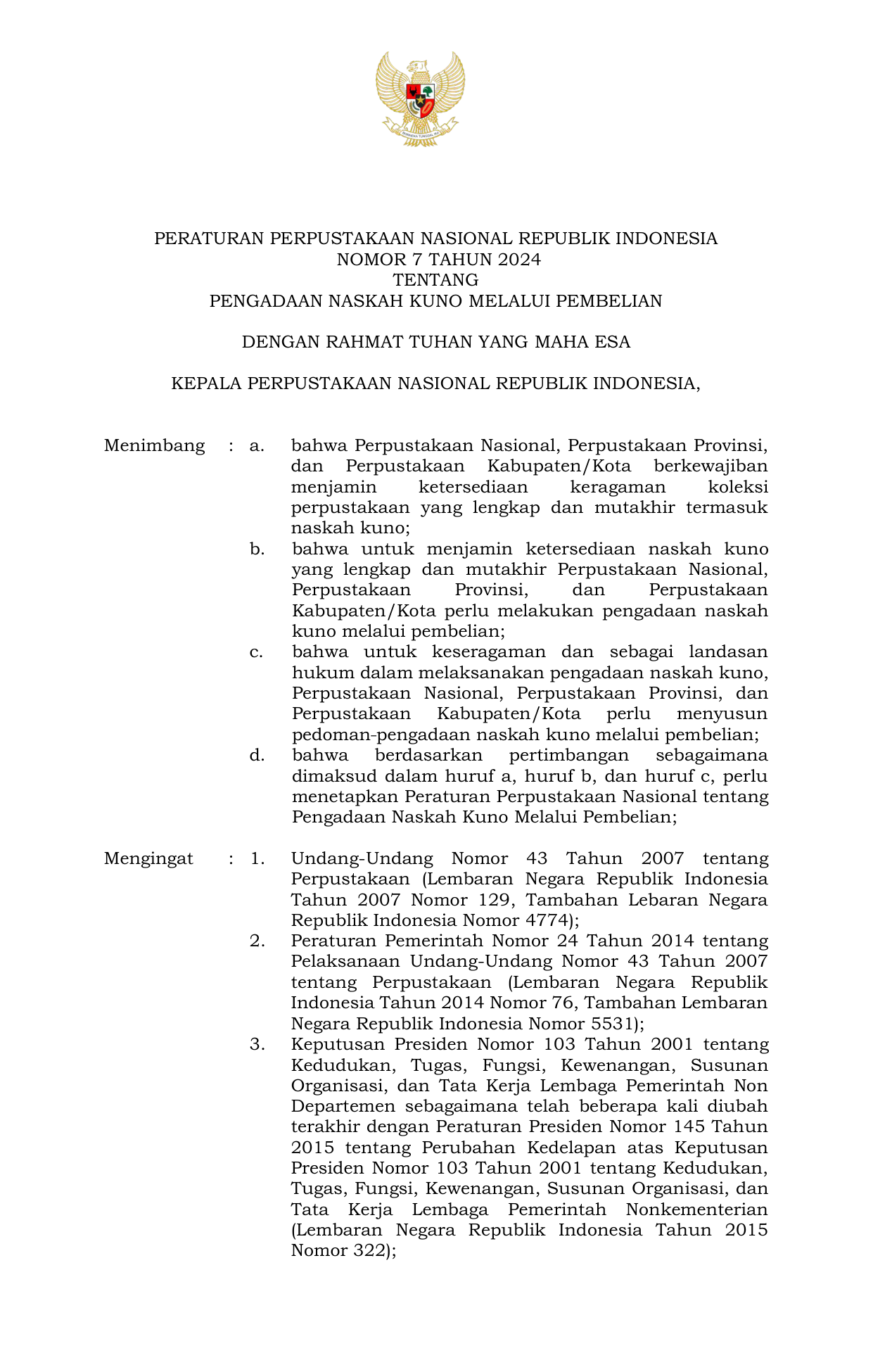 PERBAN Nomor 7 Tahun 2024 | Peraturan Badan Nomor 7 Tahun 2024 tentang Pengadaan Naskah Kuno Melalui Pembelian