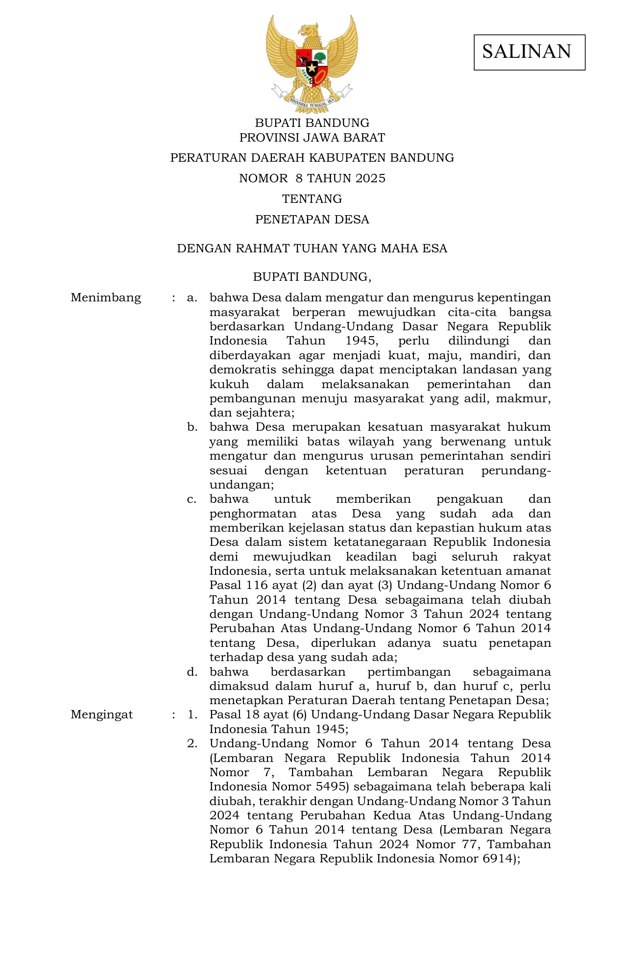 PERDA Nomor 8 Tahun 2025 | Peraturan Daerah Nomor 8 Tahun 2025 tentang PERATURAN DAERAH KABUPATEN BANDUNG NOMOR 8 TAHUN 2025 TENTANG PENETAPAN DESA