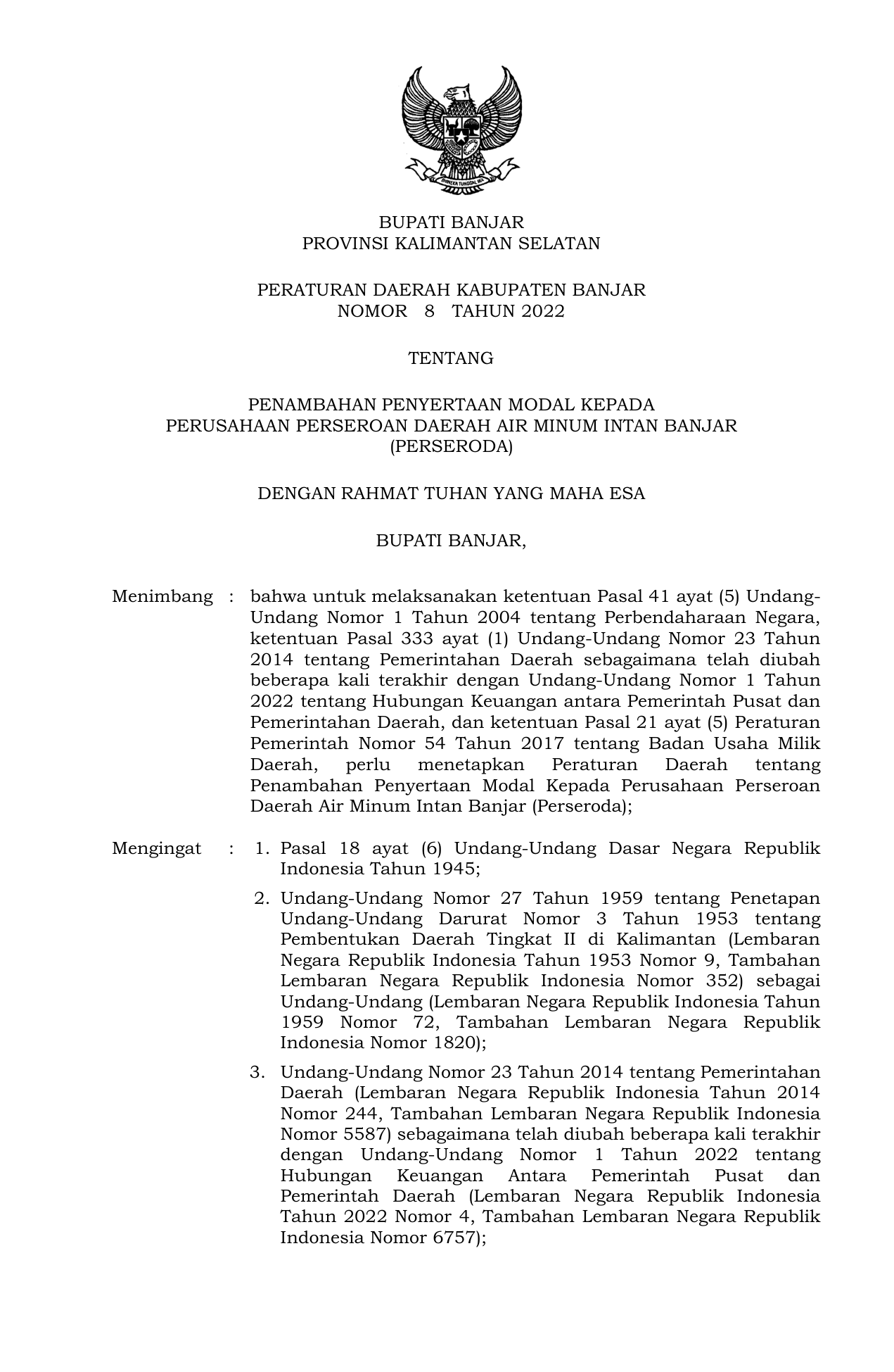 PERDA Nomor 8 Tahun 2022 | Peraturan Daerah Nomor 8 Tahun 2022 tentang Penambahan Penyertaan Modal Kepada Perusahaan Perseroan Daerah Air Minum Intan Banjar (PERSERODA)