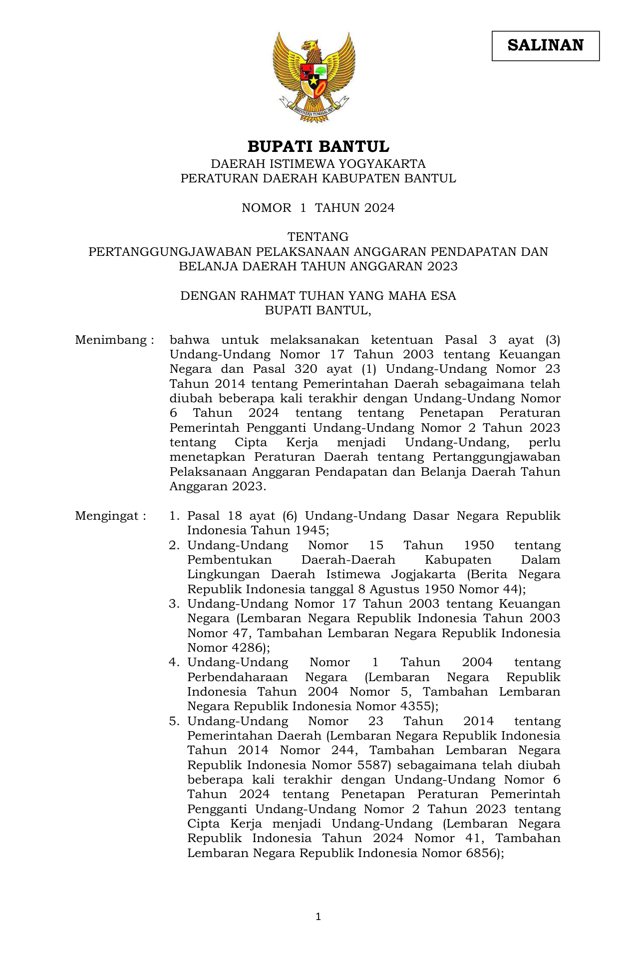 LEMBARAN DAERAH KABUPATEN BANTUL TAHUN 2024 NOMOR 1