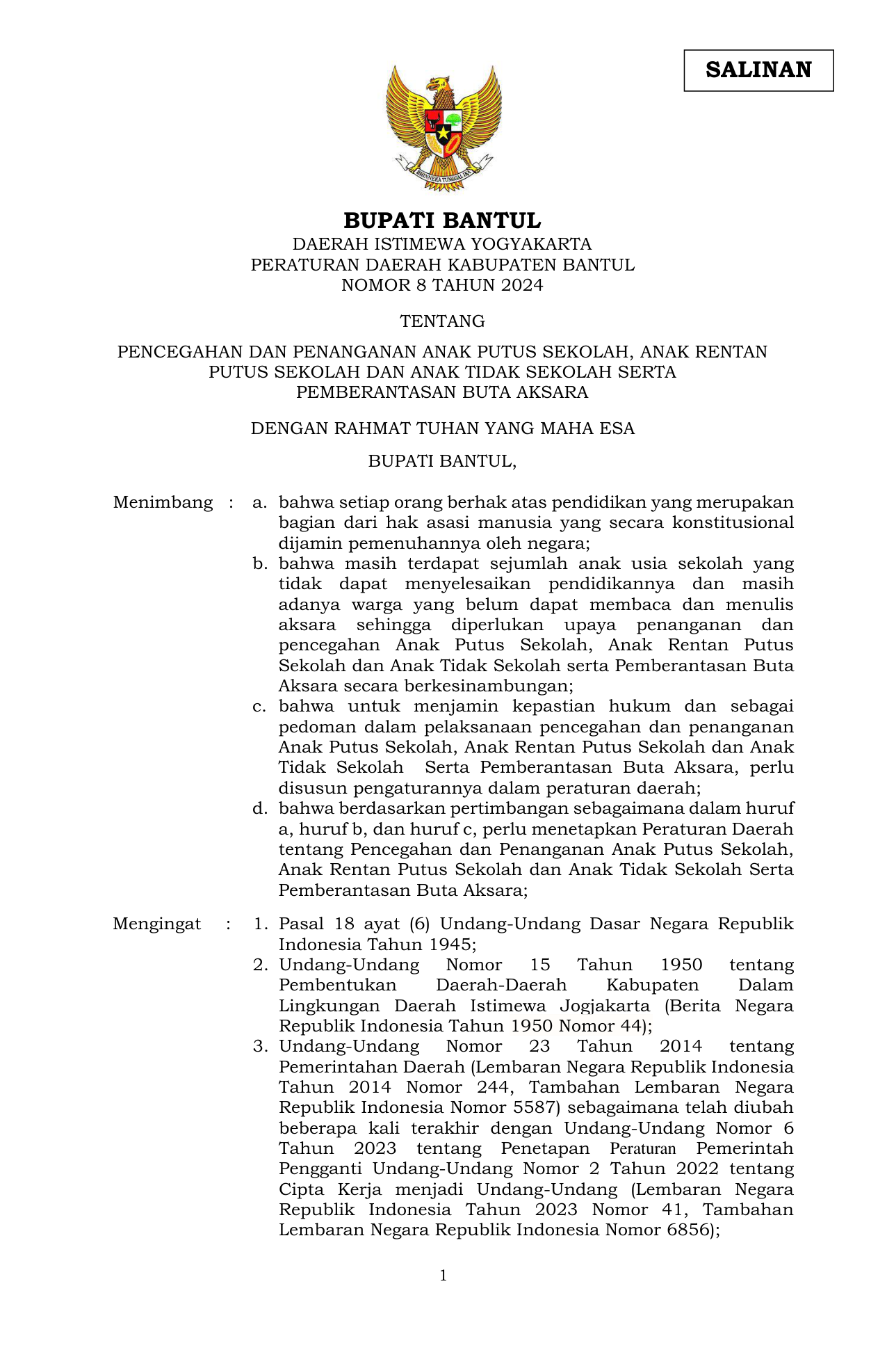 PERDA Nomor 8 Tahun 2024 | Peraturan Daerah Nomor 8 Tahun 2024 tentang Pencegahan dan Penanganan Anak Putus Sekolah, Anak Rentan Putus Sekolah dan Anak Tidak Sekolah Serta Pemberantasan Buta Aksara