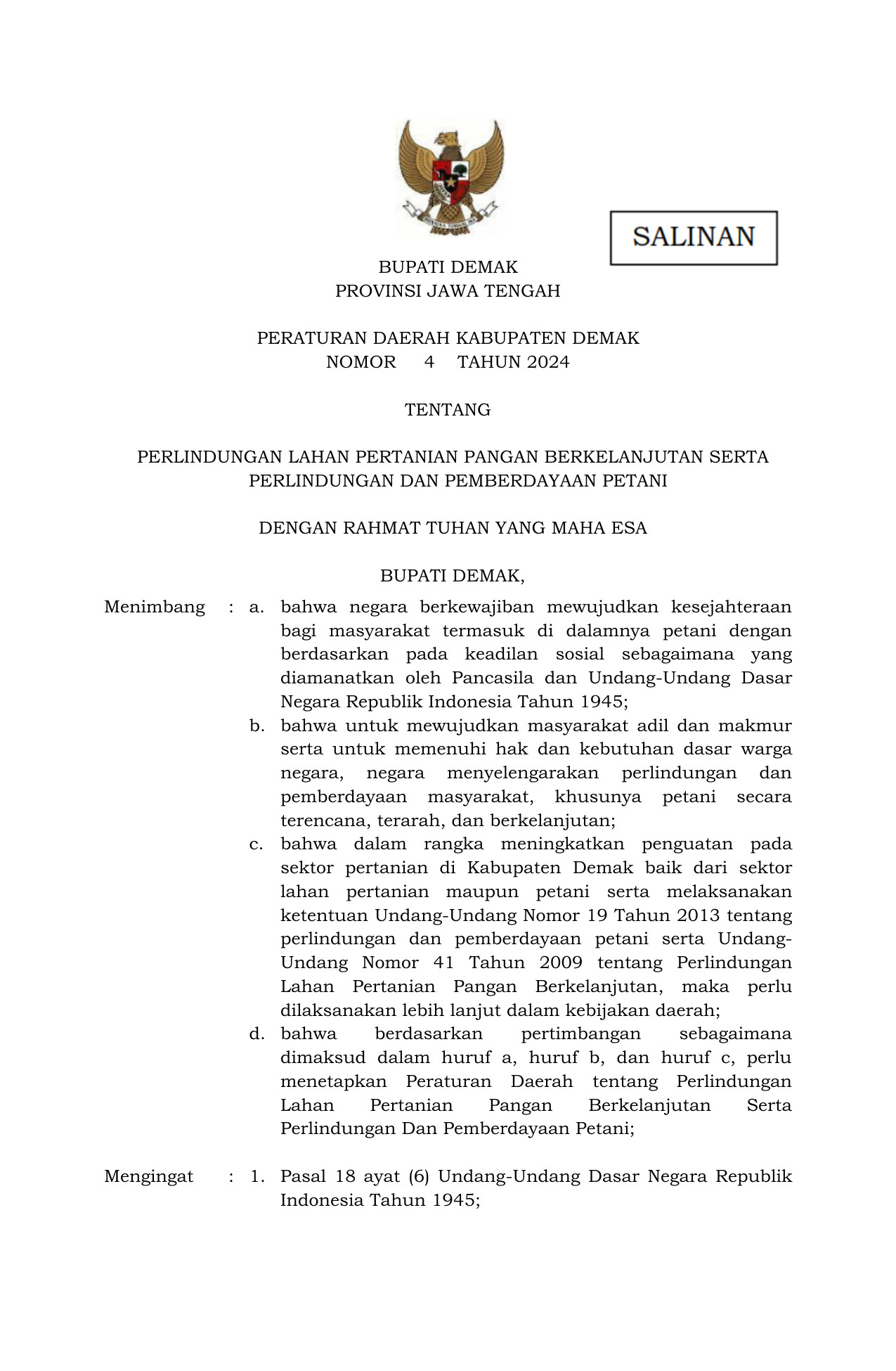 PERDA Nomor 4 Tahun 2024 | Peraturan Daerah Nomor 4 Tahun 2024 tentang Perlindungan Lahan Pertanian Pangan Berkelanjutan Serta Perlindungan dan Pemberdayaan Petani
