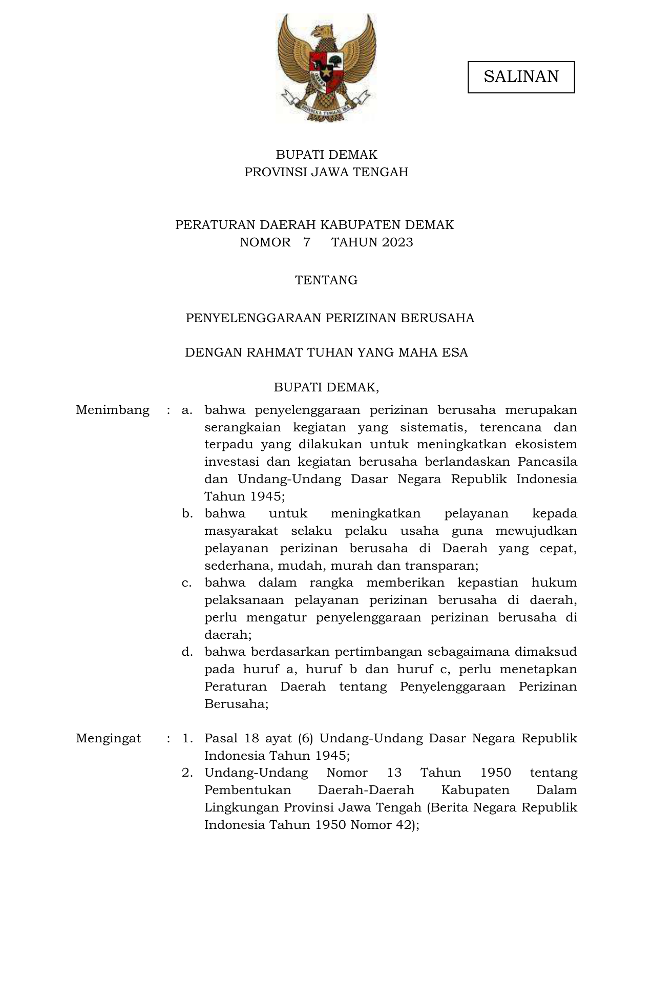 PERDA Nomor 7 Tahun 2023 | Peraturan Daerah Nomor 7 Tahun 2023 tentang PENYELENGGARAAN PERIZINAN BERUSAHA