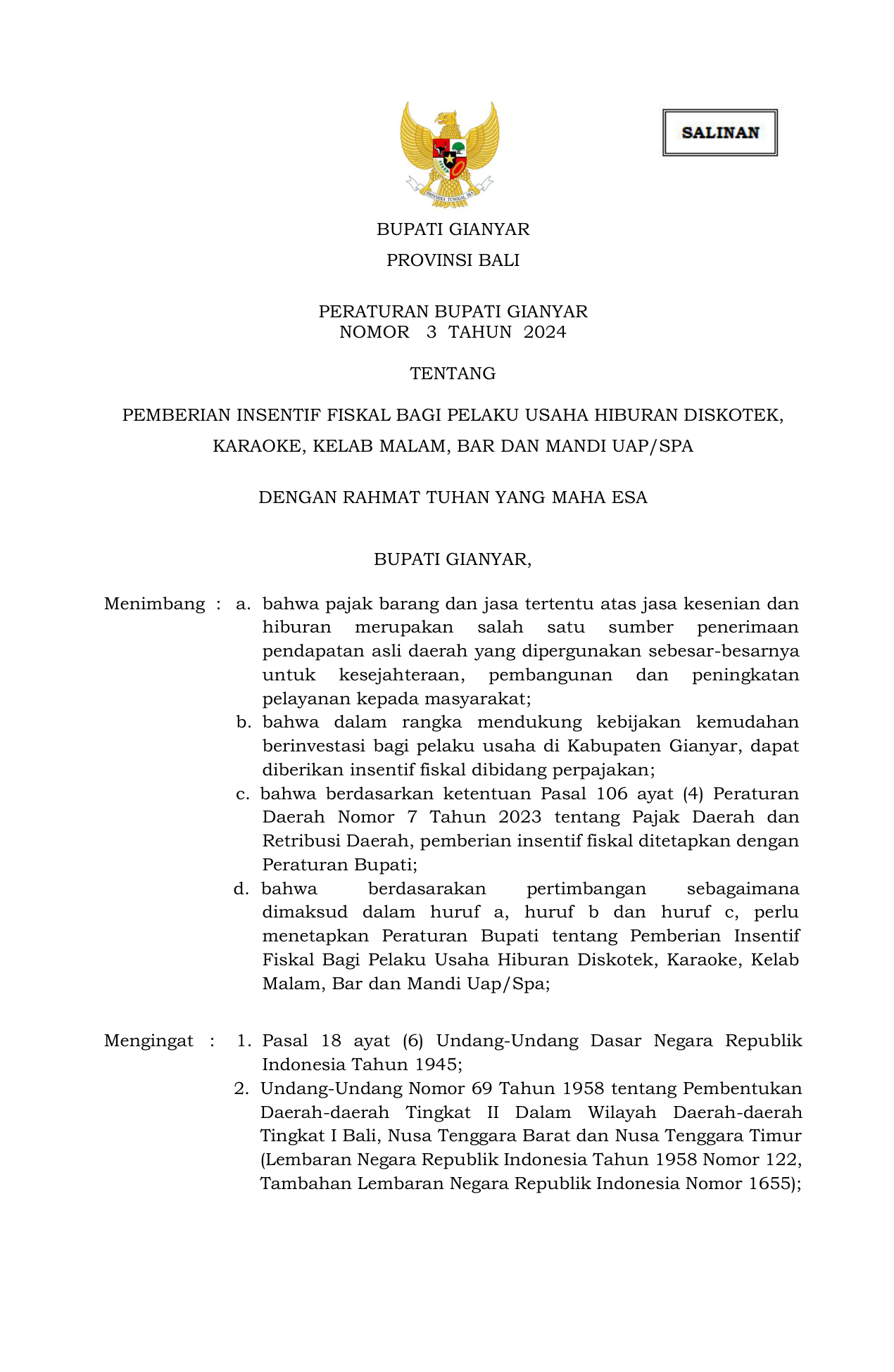 PERDA Nomor 3 Tahun 2024 | Peraturan Daerah Nomor 3 Tahun 2024 tentang PEMBERIAN INSENTIF FISKAL BAGI PELAKU USAHA HIBURAN DISKOTEK, KARAOKE, KELAB MALAM, BAR DAN MANDI UAP/SPA