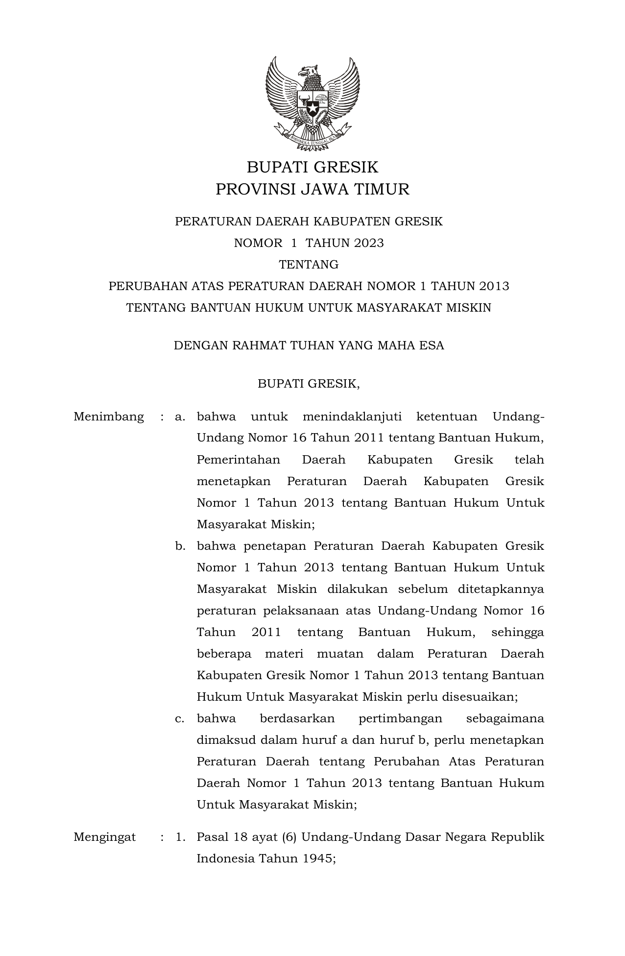 PERDA Nomor 1 Tahun 2023 | Peraturan Daerah Nomor 1 Tahun 2023 tentang PERUBAHAN ATAS PERATURAN DAERAH NOMOR 1 TAHUN 2013TENTANG BANTUAN HUKUM UNTUK MASYARAKAT MISKIN
