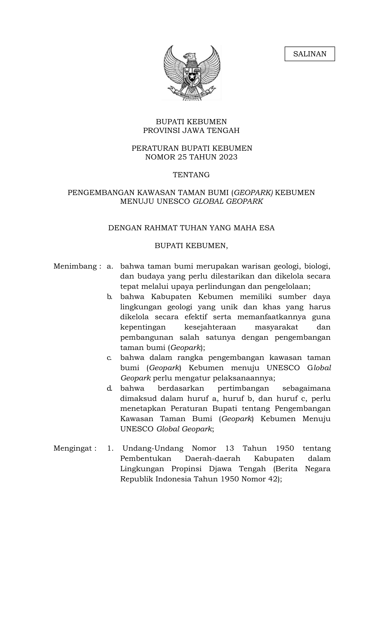 PERDA Nomor 25 Tahun 2023 | Peraturan Daerah Nomor 25 Tahun 2023 tentang Pengembangan Kawasan Taman Bumi (GeoPark) Kebumen Menuju UNESCO Global GeoPark