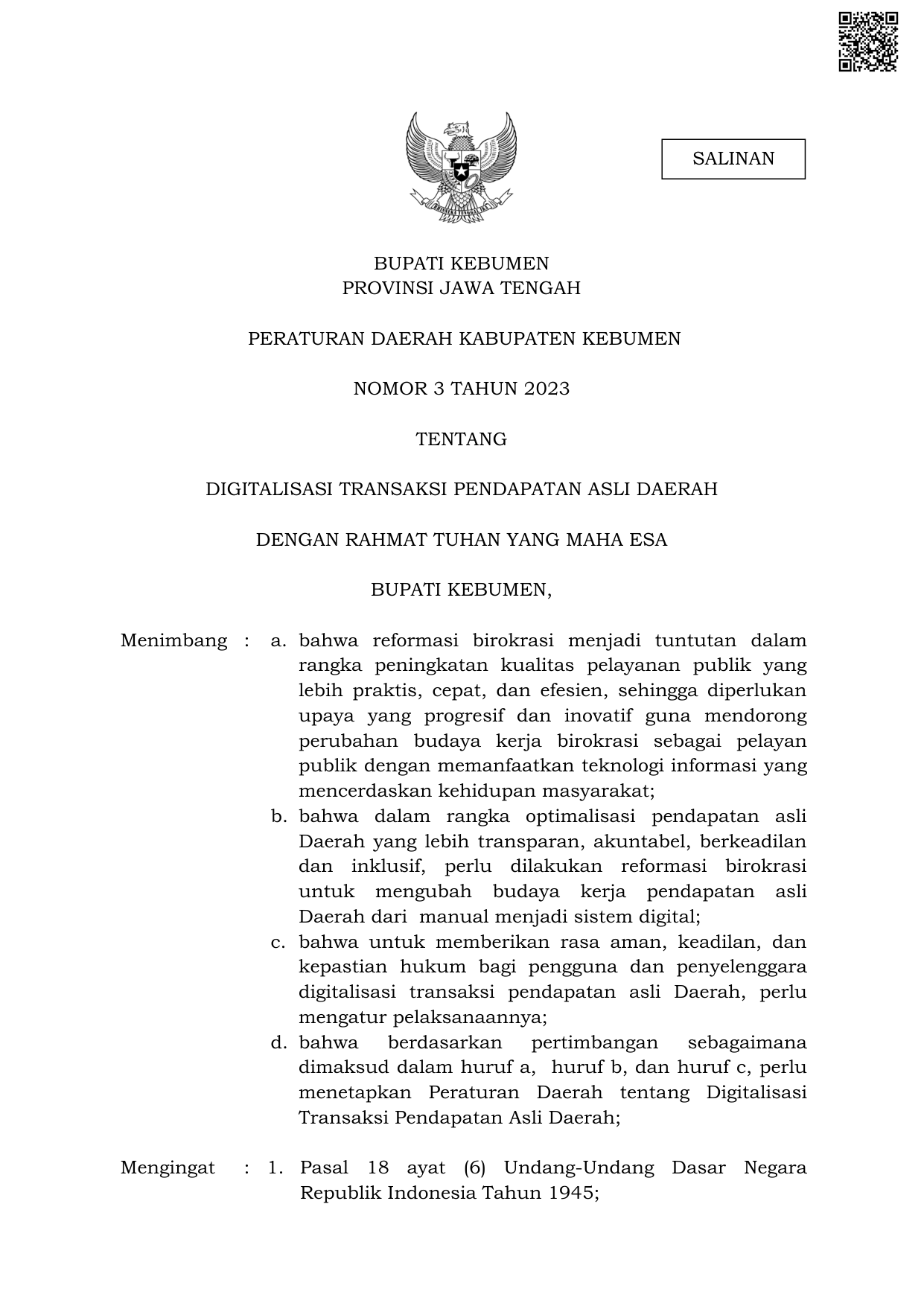 PERDA Nomor 3 Tahun 2023 | Peraturan Daerah Nomor 3 Tahun 2023 tentang DIGITALISASI TRANSAKSI PENDAPATAN ASLI DAERAH