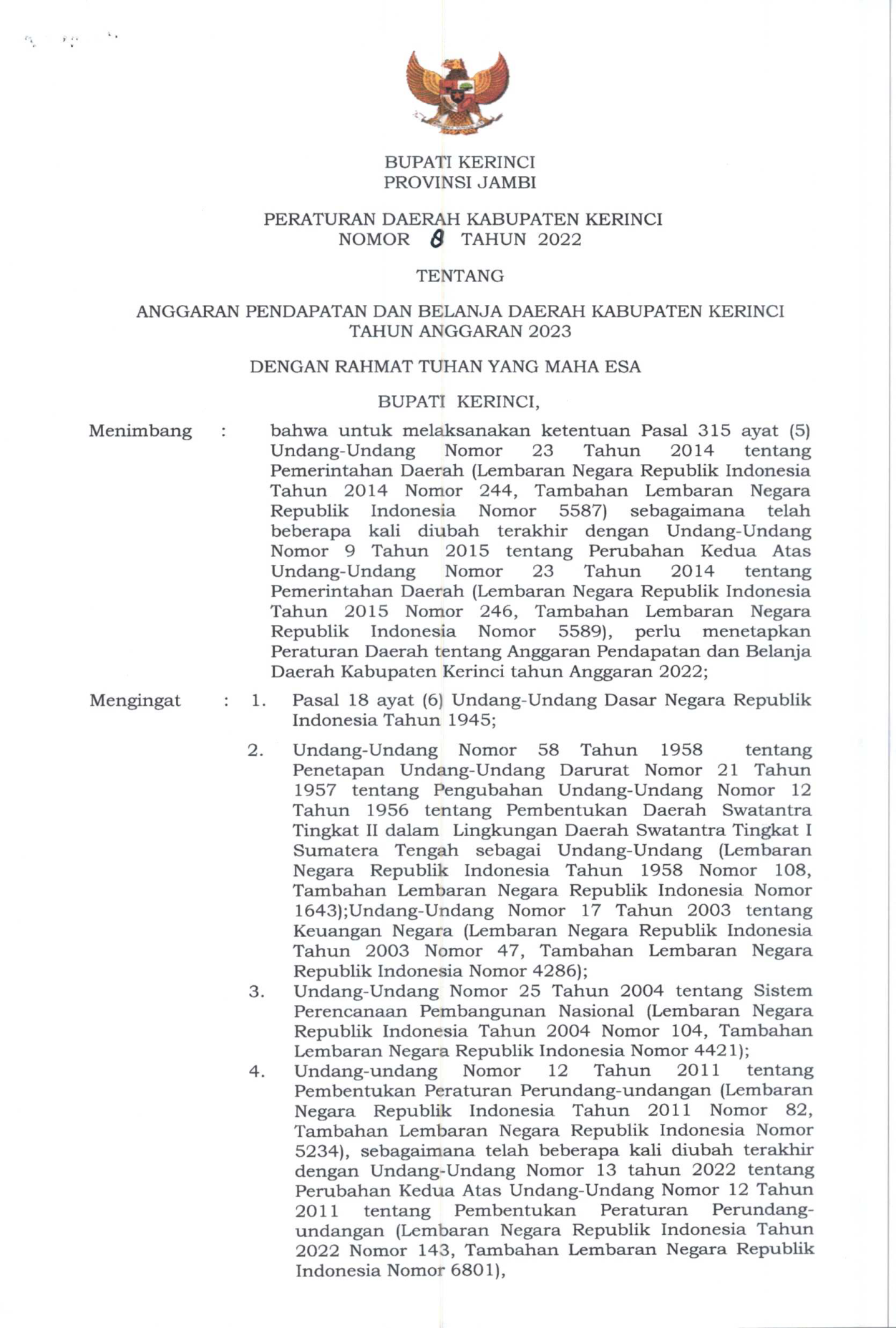 PERDA Nomor 8 Tahun 2022 | Peraturan Daerah Nomor 8 Tahun 2022 tentang Anggaran Pendapatan dan Belanja Daerah Kabupaten Kerinci Tahun Anggaran 2023 (APBD Tahun 2023)