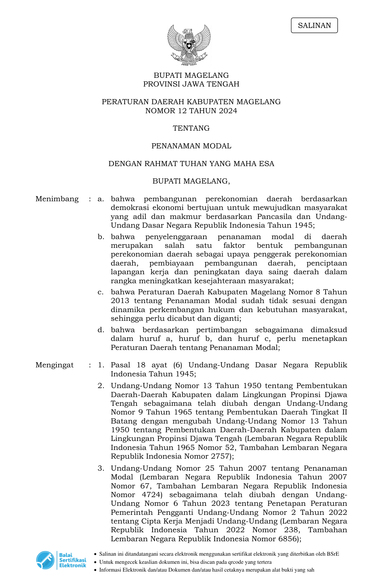 PERDA Nomor 12 Tahun 2024 | Peraturan Daerah Nomor 12 Tahun 2024 tentang PENANAMAN MODAL