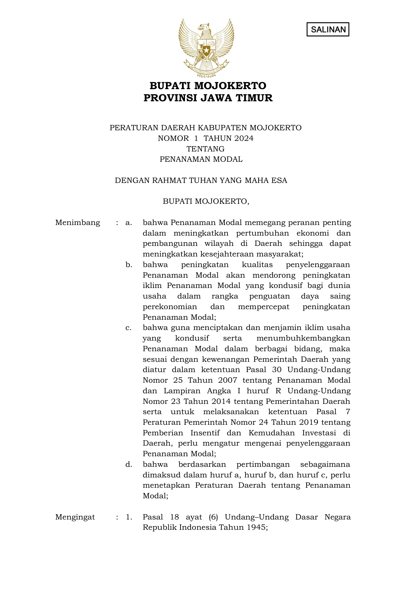 PERDA Nomor 1 Tahun 2024 | Peraturan Daerah Nomor 1 Tahun 2024 tentang PENANAMAN MODAL