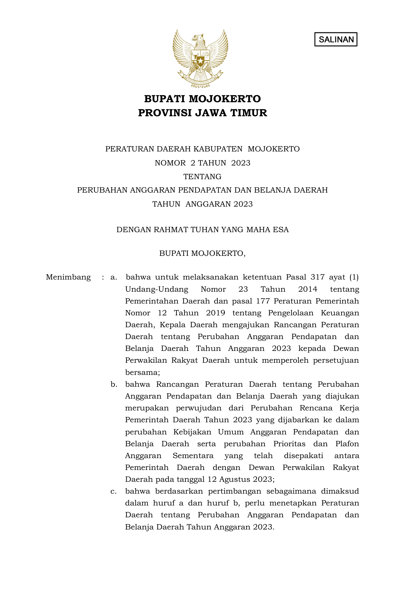 PERDA Nomor 2 Tahun 2023 | Peraturan Daerah Nomor 2 Tahun 2023 tentang PERUBAHAN ANGGARAN PENDAPATAN DAN BELANJA DAERAH TAHUN ANGGARAN 2023