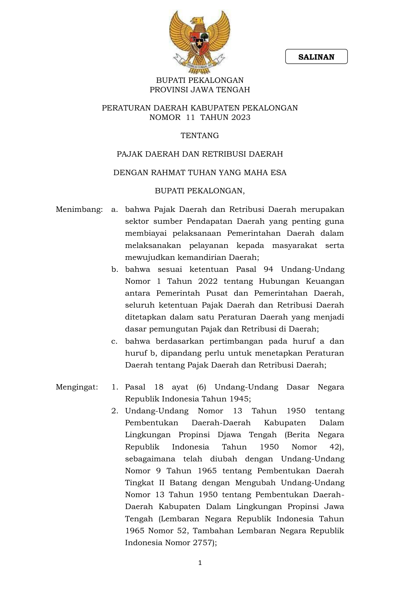 PERDA Nomor 11 Tahun 2023 | Peraturan Daerah Nomor 11 Tahun 2023 tentang PAJAK DAERAH DAN RETRIBUSI DAERAH