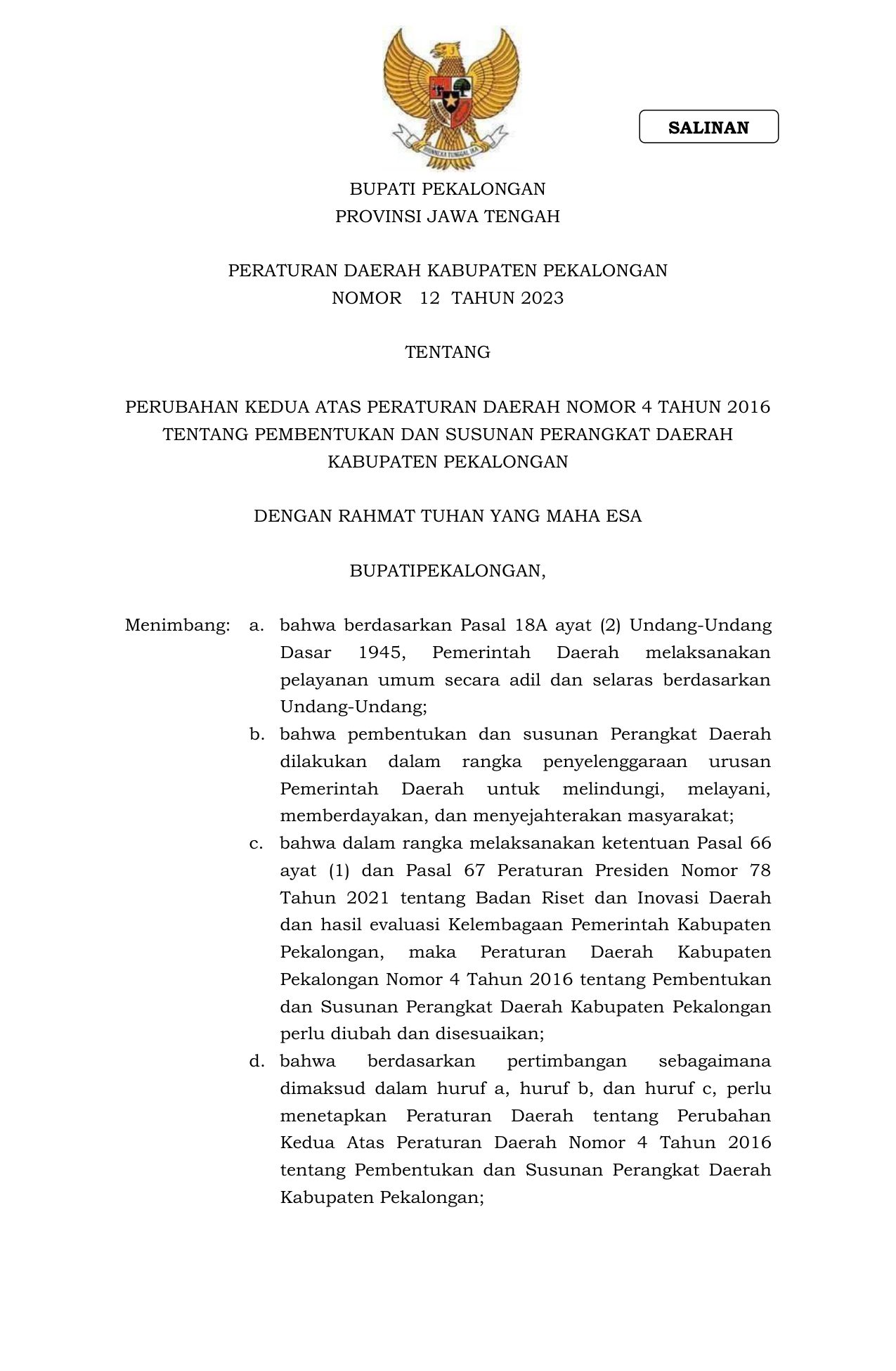 PERDA Nomor 12 Tahun 2023 | Peraturan Daerah Nomor 12 Tahun 2023 tentang PERUBAHAN KEDUA ATAS PERATURAN DAERAH NOMOR 4 TAHUN 2016 TENTANG PEMBENTUKAN DAN SUSUNAN PERANGKAT DAERAH KABUPATEN PEKALONGAN