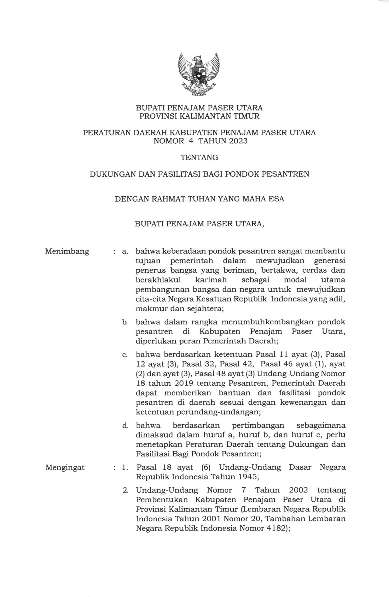 PERDA Nomor 4 Tahun 2023 | Peraturan Daerah Nomor 4 Tahun 2023 tentang DUKUNGAN DAN FASILITASI BAGI PONDOK PESANTREN