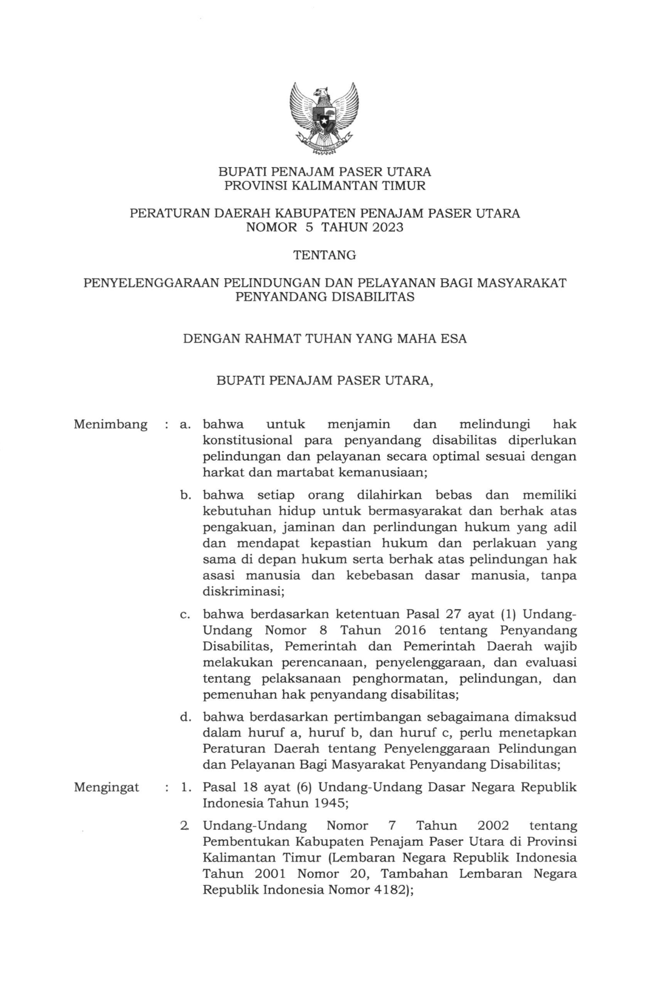 PERDA Nomor 5 Tahun 2023 | Peraturan Daerah Nomor 5 Tahun 2023 tentang PENYELENGGARAAN PELINDUNGAN DAN PELAYANAN BAGI MASYARAKATPENYANDANG DISABILITAS