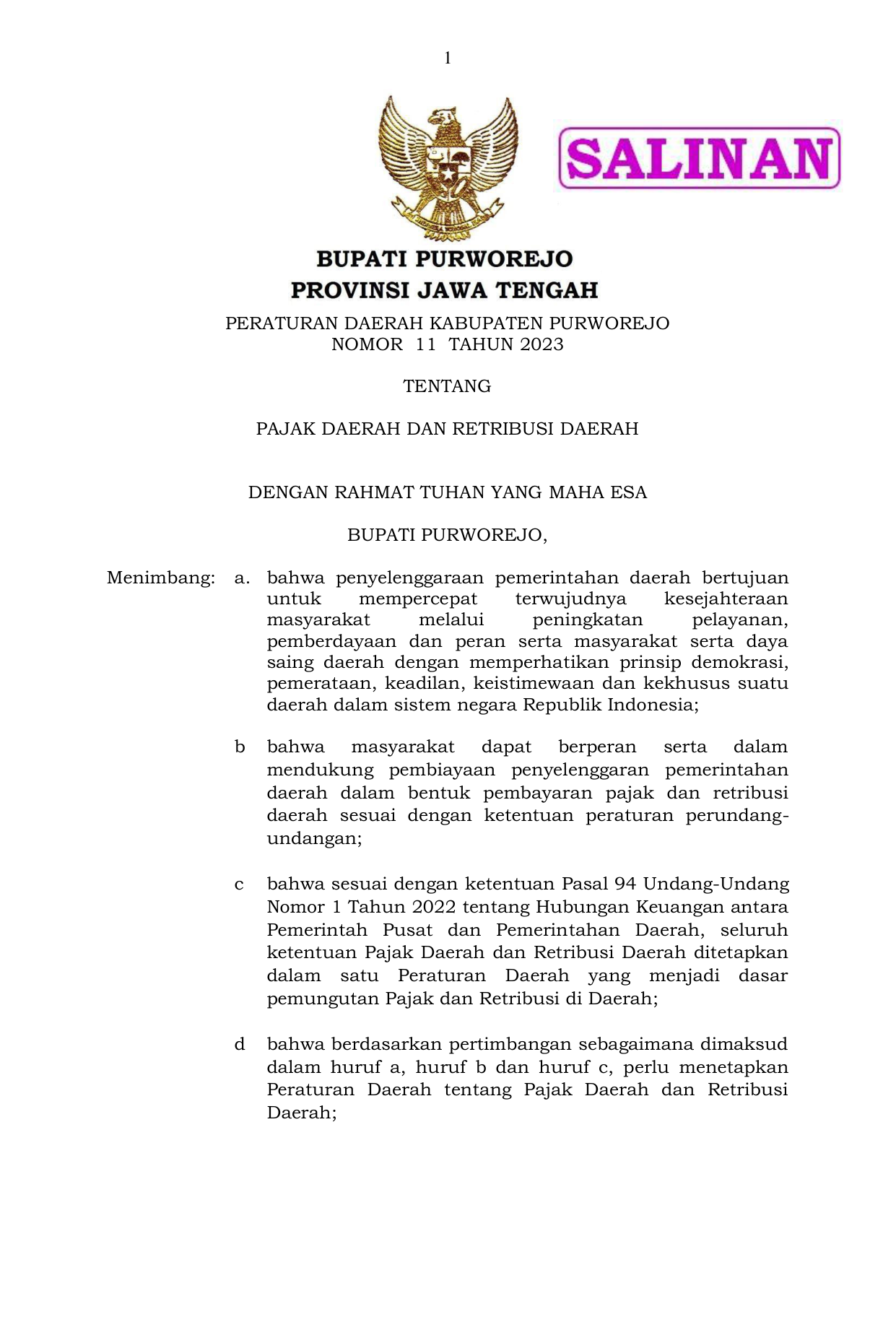 PERDA Nomor 11 Tahun 2023 | Peraturan Daerah Nomor 11 Tahun 2023 tentang PAJAK DAERAH DAN RETRIBUSI DAERAH