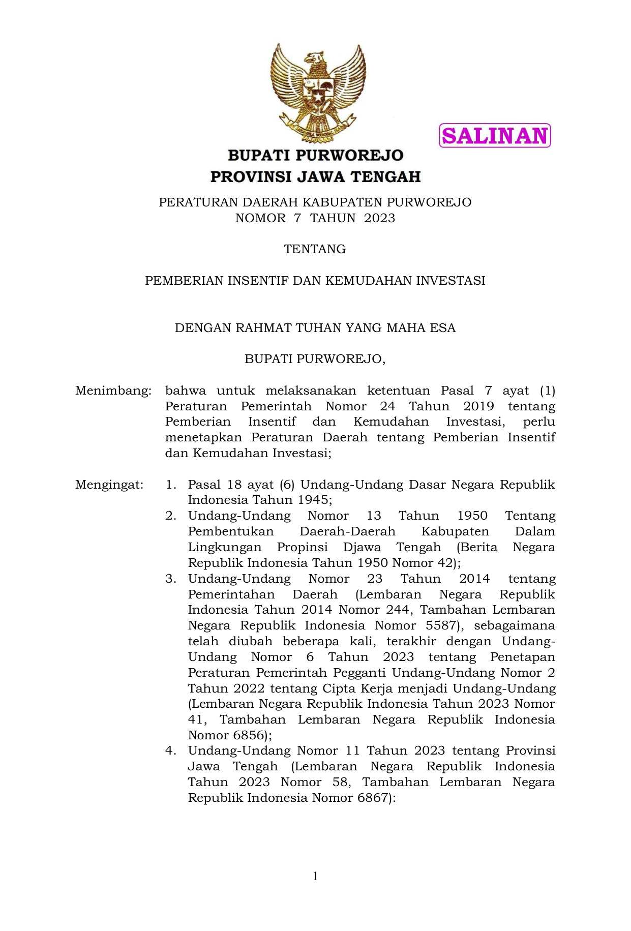 PERDA Nomor 7 Tahun 2023 | Peraturan Daerah Nomor 7 Tahun 2023 tentang PEMBERIAN INSENTIF DAN KEMUDAHAN INVESTASI