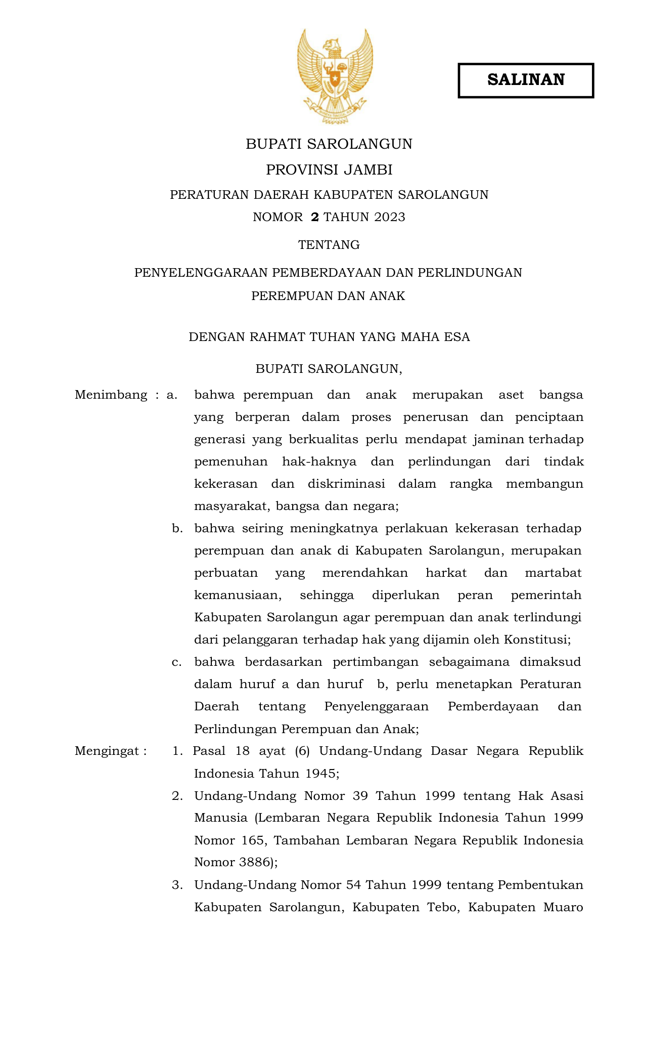 PERDA Nomor 2 Tahun 2023 | Peraturan Daerah Nomor 2 Tahun 2023 tentang Penyelenggaraan Pemberdayaan Dan Perlindungan Perempuan Dan Anak