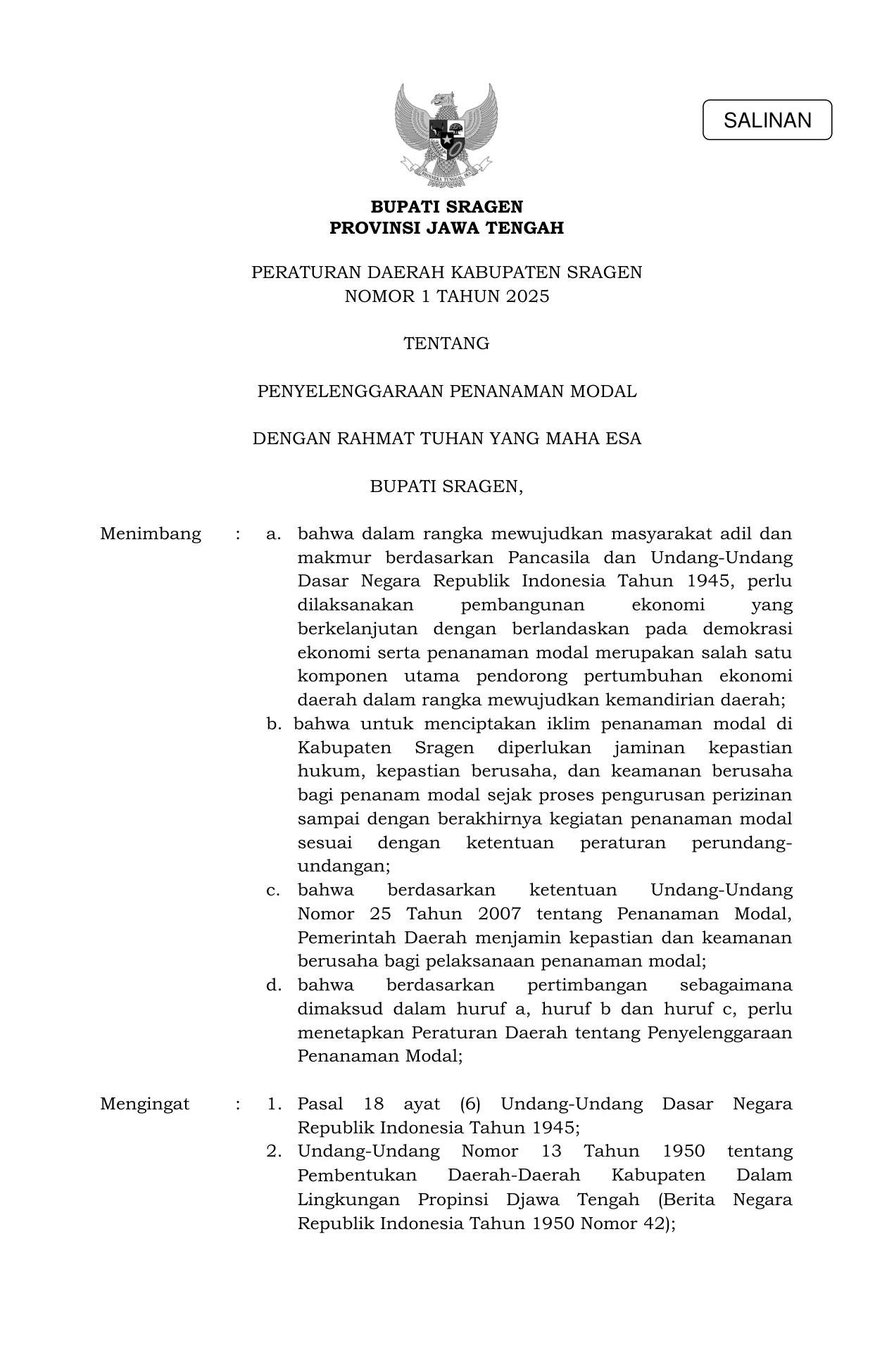 PERDA Nomor 1 Tahun 2025 | Peraturan Daerah Nomor 1 Tahun 2025 tentang Penyelenggaraan Penanaman Modal