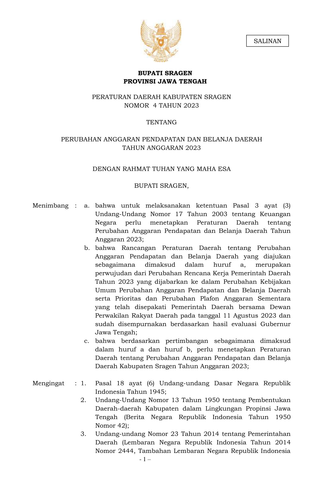 PERDA Nomor 4 Tahun 2023 | Peraturan Daerah Nomor 4 Tahun 2023 tentang PERUBAHAN ANGGARAN PENDAPATAN DAN BELANJA DAERAH TAHUN ANGGARAN 2023