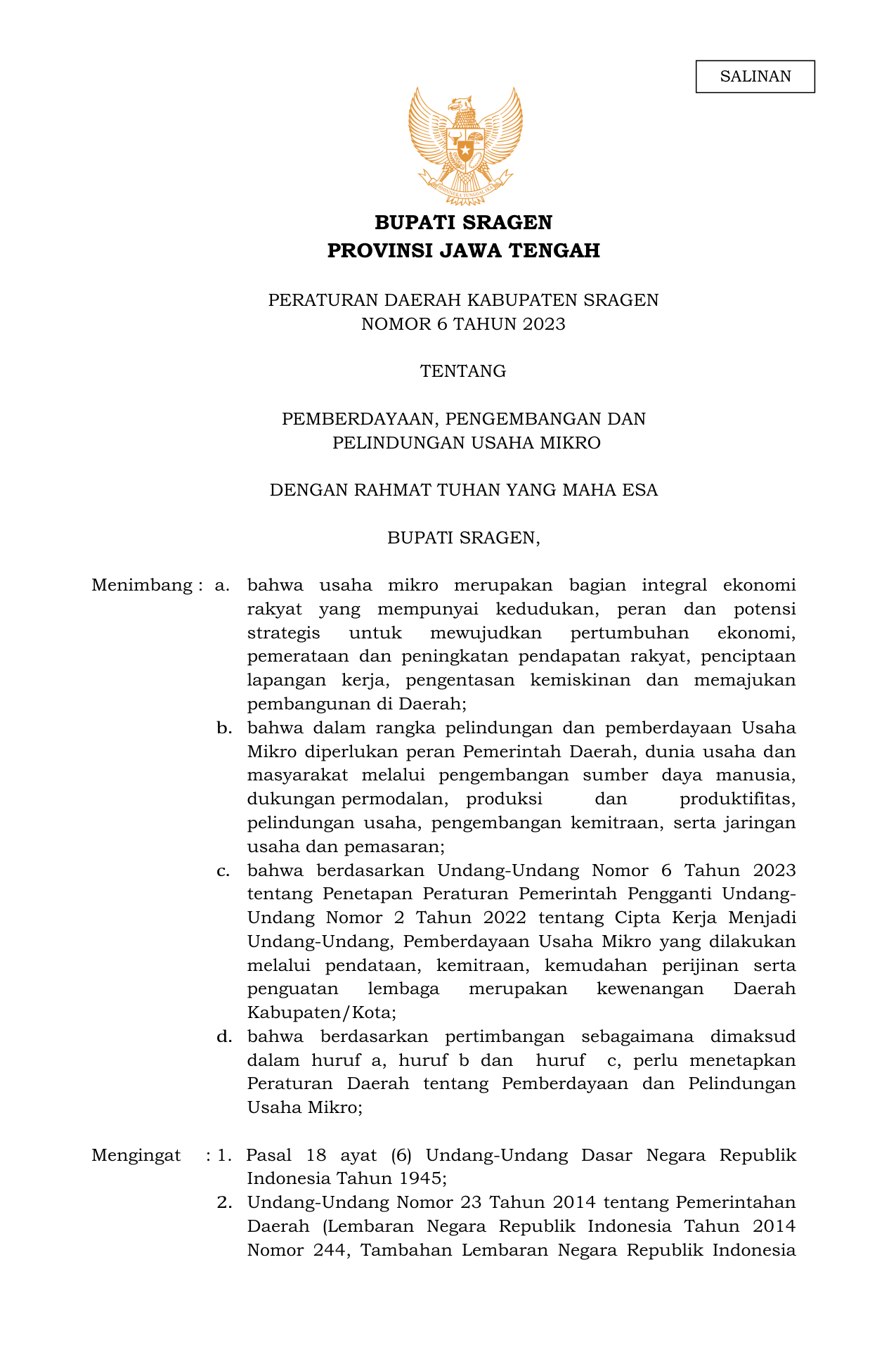 PERDA Nomor 6 Tahun 2023 | Peraturan Daerah Nomor 6 Tahun 2023 tentang PEMBERDAYAAN, PENGEMBANGAN DAN PERLINDUNGAN USAHA MIKRO