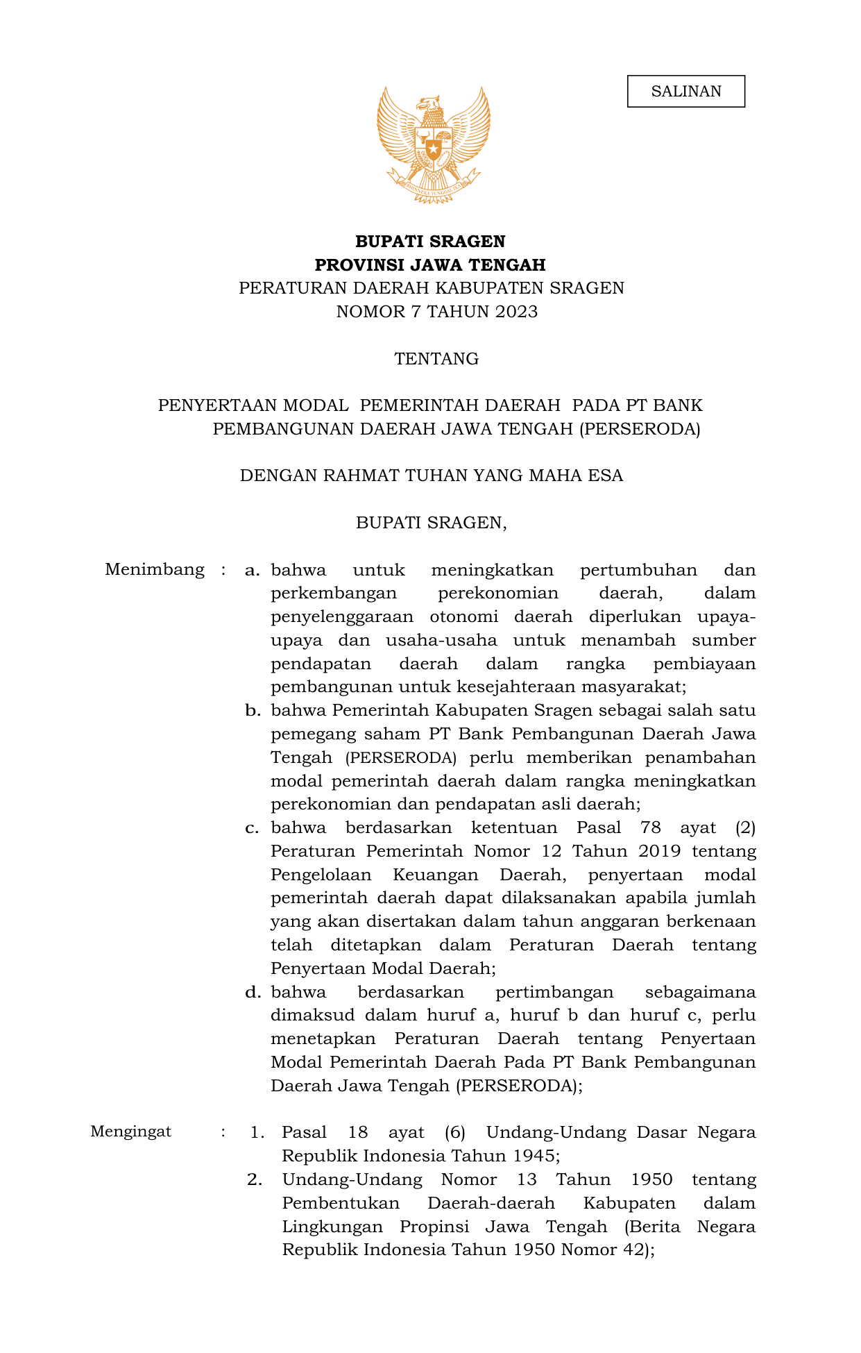 PERDA Nomor 7 Tahun 2023 | Peraturan Daerah Nomor 7 Tahun 2023 tentang PENYERTAAN MODAL PEMERINTAH DAERAH PADA PT BANK PEMBANGUNAN DAERAH JAWA TENGAH (PERSERODA)