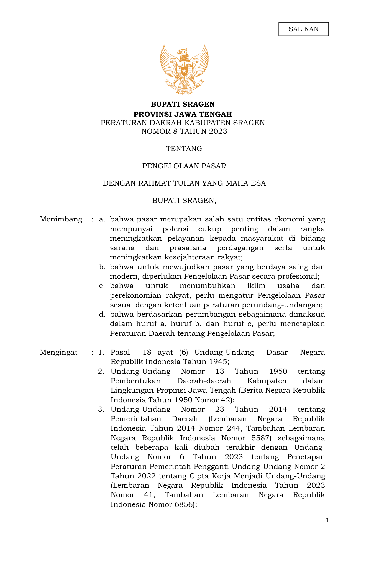PERDA Nomor 8 Tahun 2023 | Peraturan Daerah Nomor 8 Tahun 2023 tentang PENGELOLAAN PASAR
