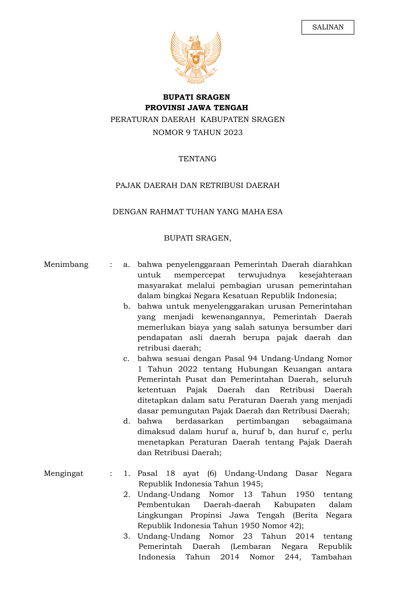 PERDA Nomor 9 Tahun 2023 | Peraturan Daerah Nomor 9 Tahun 2023 tentang PAJAK DAERAH DAN RETRIBUSI DAERAH