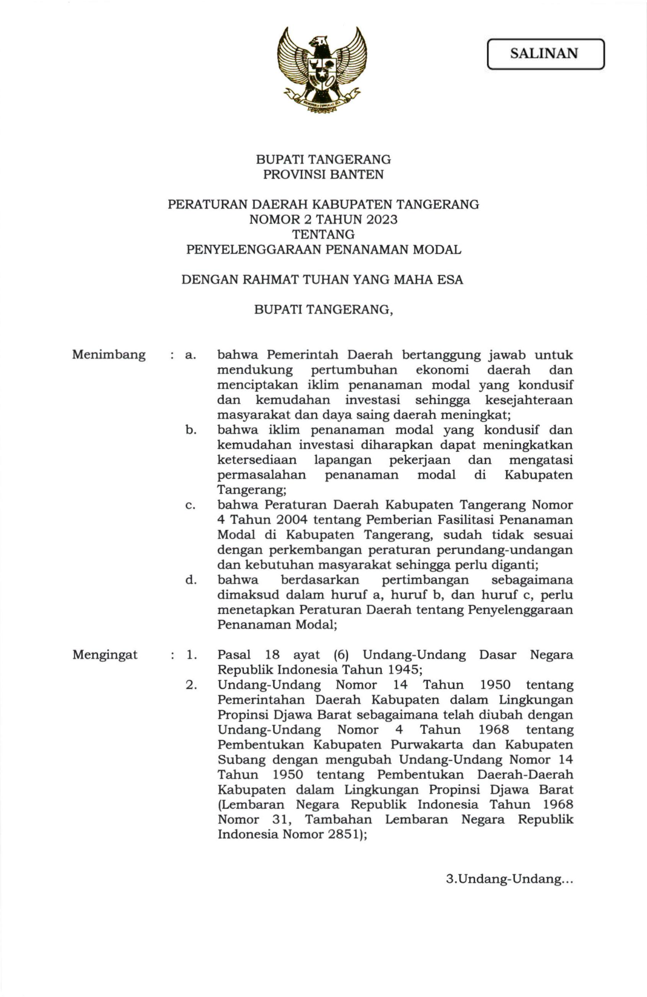 PERDA Nomor 2 Tahun 2023 | Peraturan Daerah Nomor 2 Tahun 2023 tentang PENYELENGGARAAN PENANAMAN MODAL