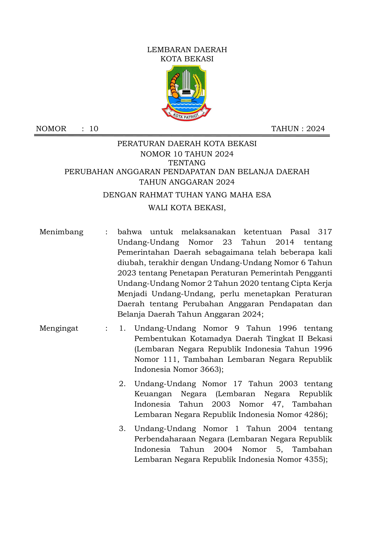 PERDA Nomor 10 Tahun 2024 | Peraturan Daerah Nomor 10 Tahun 2024 tentang Perubahan Anggaran Pendapatan dan Belanja Daerah Tahun 2024