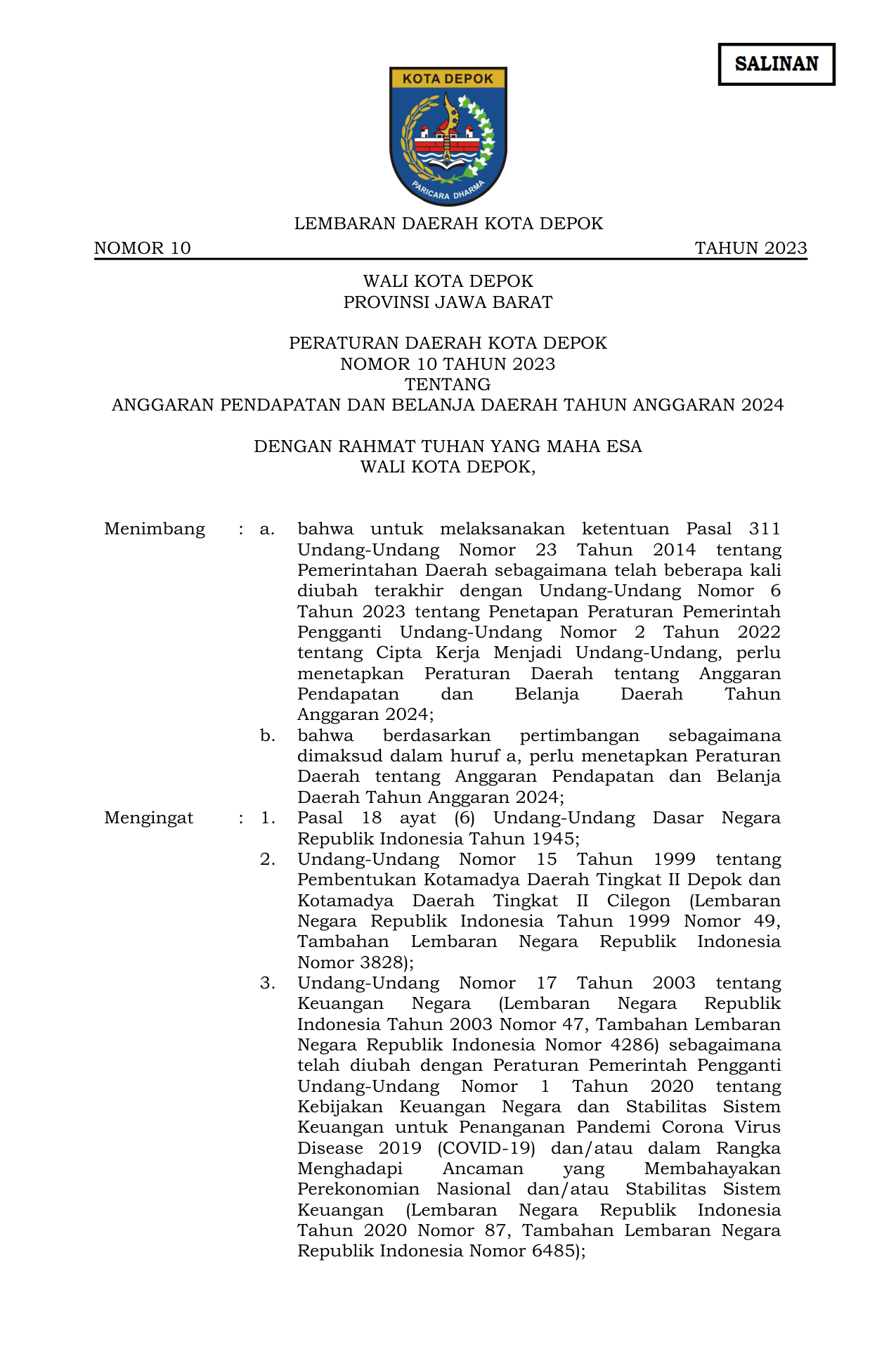 PERDA Nomor 10 Tahun 2023 | Peraturan Daerah Nomor 10 Tahun 2023 tentang ANGGARAN PENDAPATAN DAN BELANJA DAERAH TAHUN ANGGARAN 2024