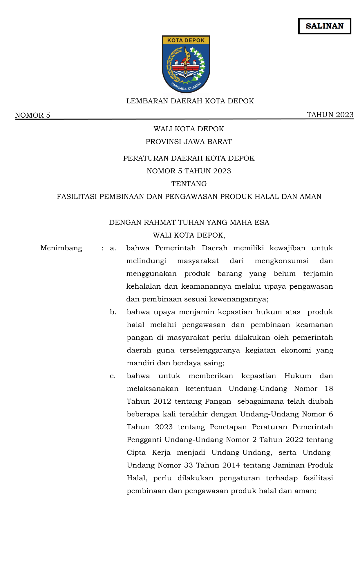 PERDA Nomor 5 Tahun 2023 | Peraturan Daerah Nomor 5 Tahun 2023 tentang FASILITASI PEMBINAAN DAN PENGAWASAN PRODUK HALAL DAN AMAN