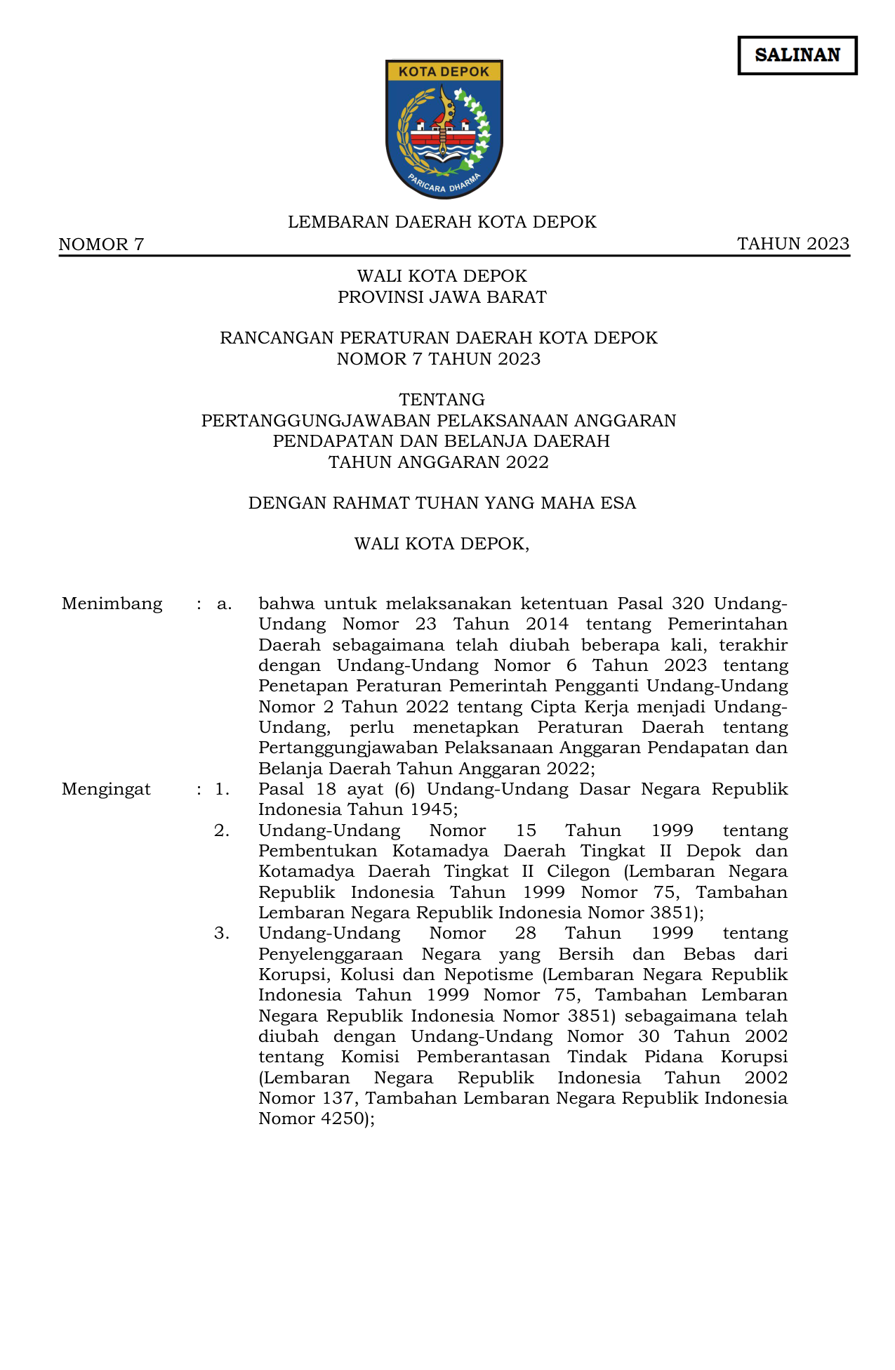PERDA Nomor 7 Tahun 2023 | Peraturan Daerah Nomor 7 Tahun 2023 tentang PERTANGGUNGJAWABAN PELAKSANAAN ANGGARAN PENDAPATAN DAN BELANJA DAERAH TAHUN ANGGARAN 2022