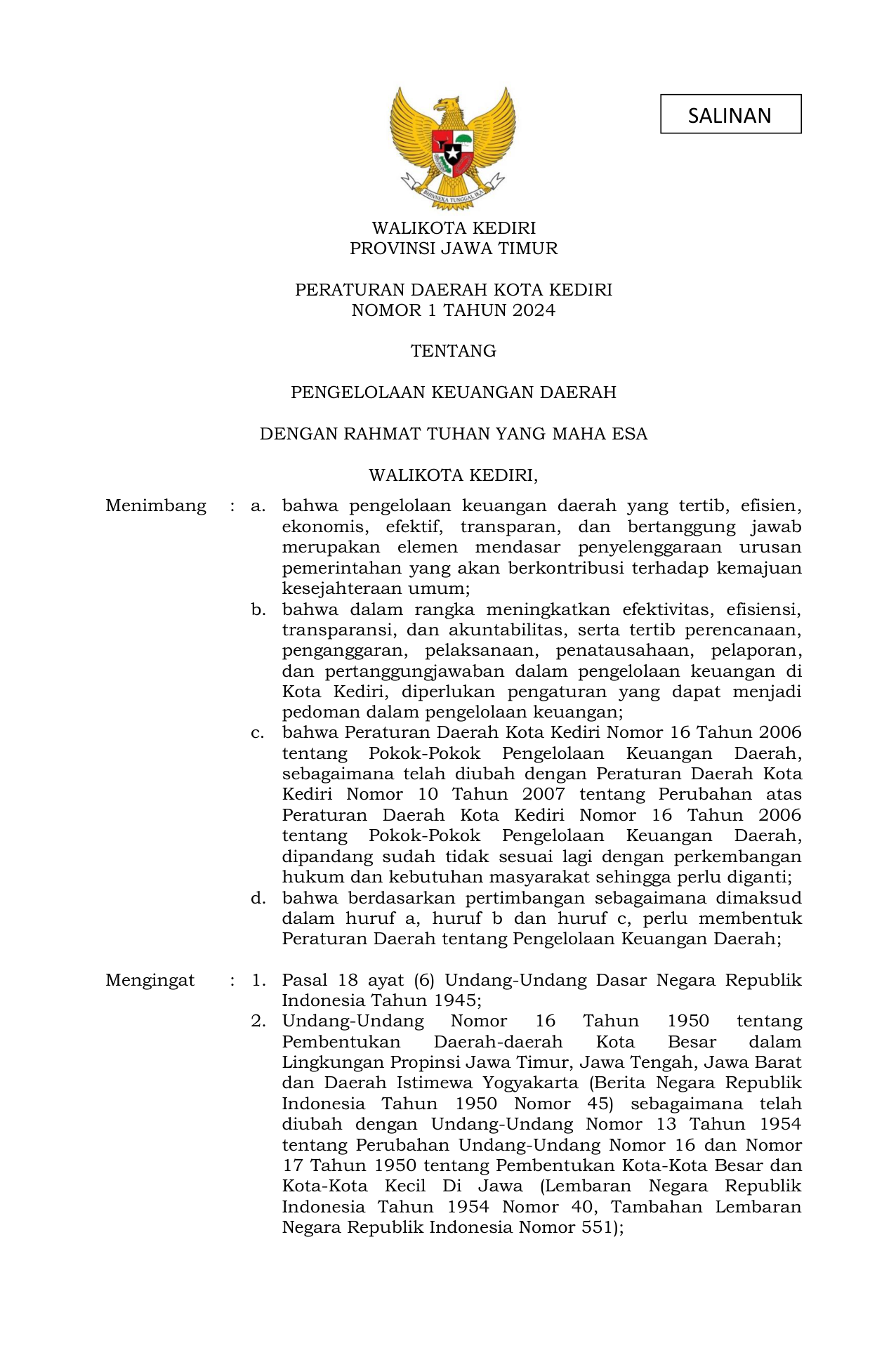 PERDA Nomor 1 Tahun 2024 | Peraturan Daerah Nomor 1 Tahun 2024 tentang PENGELOLAAN KEUANGAN DAERAH