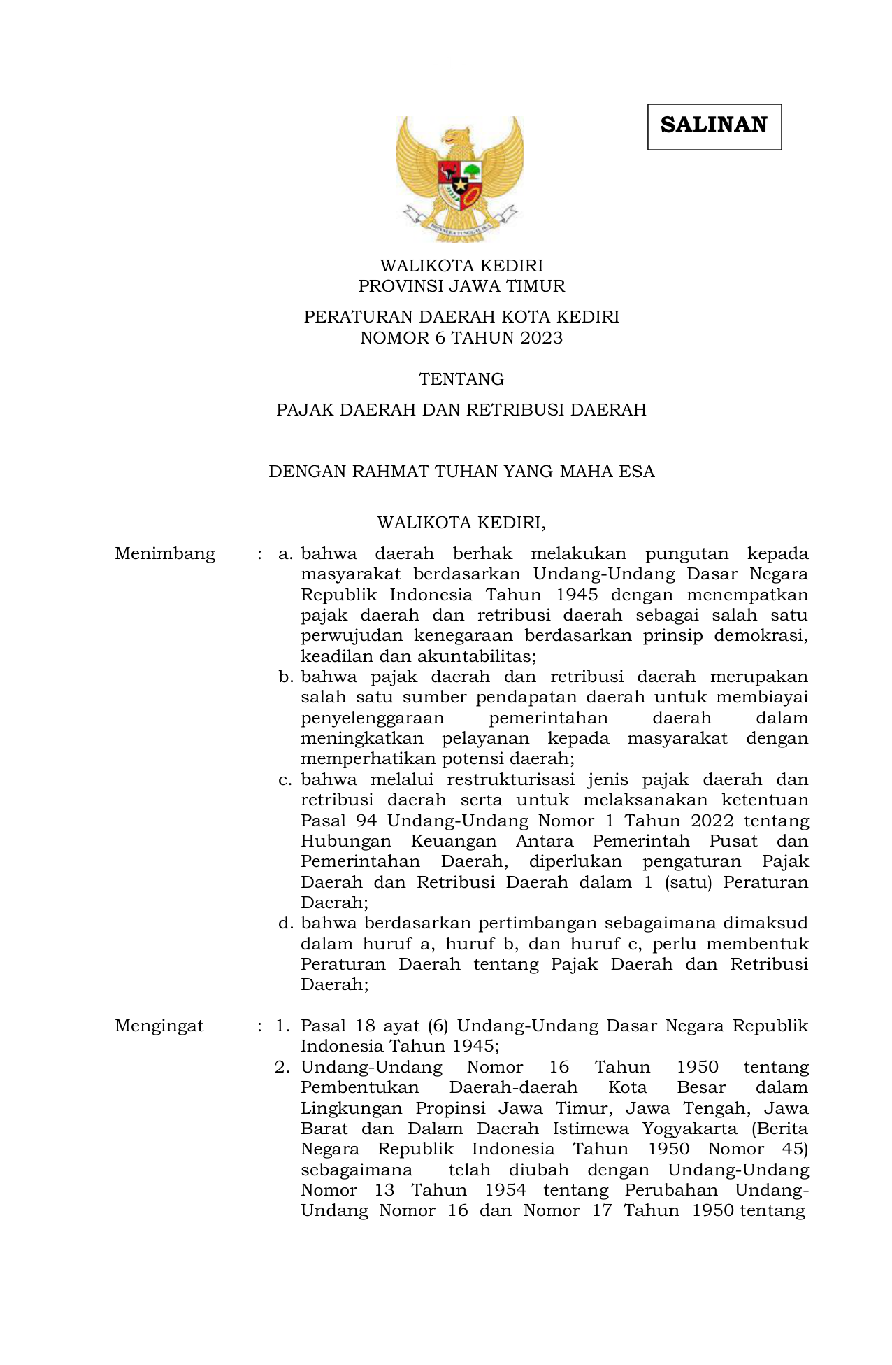 PERDA Nomor 6 Tahun 2023 | Peraturan Daerah Nomor 6 Tahun 2023 tentang PAJAK DAERAH DAN RETRIBUSI DAERAH