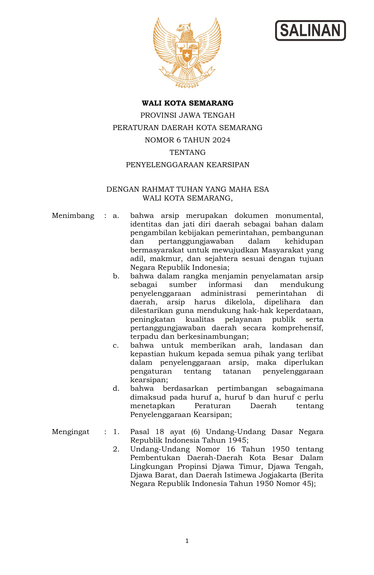PERDA Nomor 6 Tahun 2024 | Peraturan Daerah Nomor 6 Tahun 2024 tentang PENYELENGGARAAN KEARSIPAN