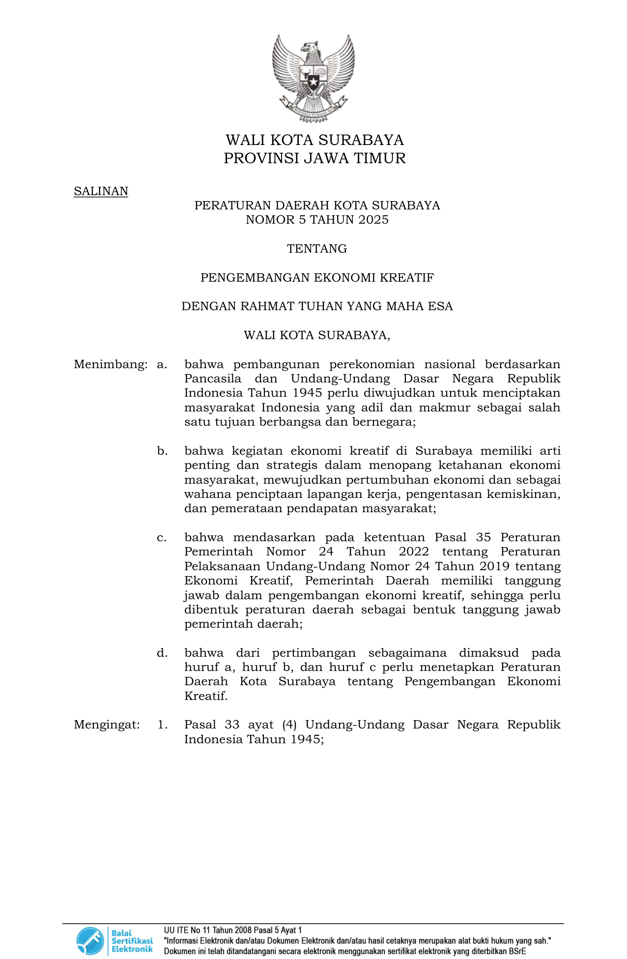 PERDA Nomor 5 Tahun 2025 | Peraturan Daerah Nomor 5 Tahun 2025 tentang PERATURAN DAERAH KOTA SURABAYA NOMOR 5 TAHUN 2025 TENTANG PENGEMBANGAN EKONOMI KREATIF