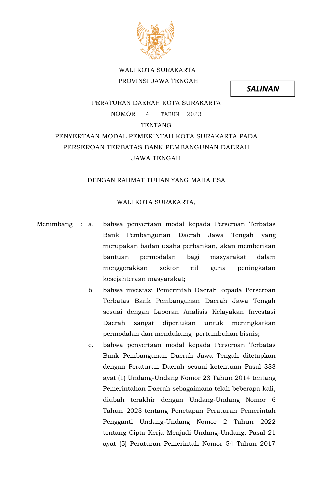 PERDA Nomor 4 Tahun 2023 | Peraturan Daerah Nomor 4 Tahun 2023 tentang PENYERTAAN MODAL PEMERINTAH KOTA SURAKARTA PADAPERSEROAN TERBATAS BANK PEMBANGUNAN DAERAHJAWA TENGAH