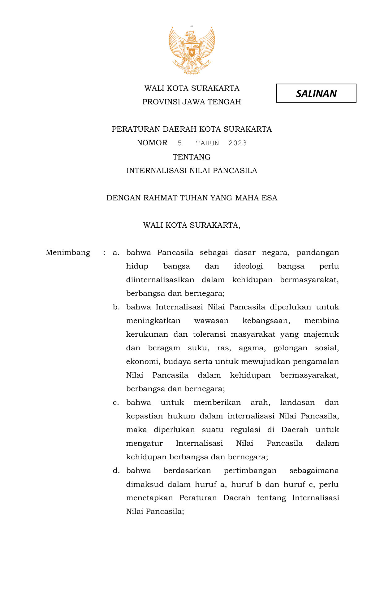 PERDA Nomor 5 Tahun 2023 | Peraturan Daerah Nomor 5 Tahun 2023 tentang INTERNALISASI NILAI PANCASILA