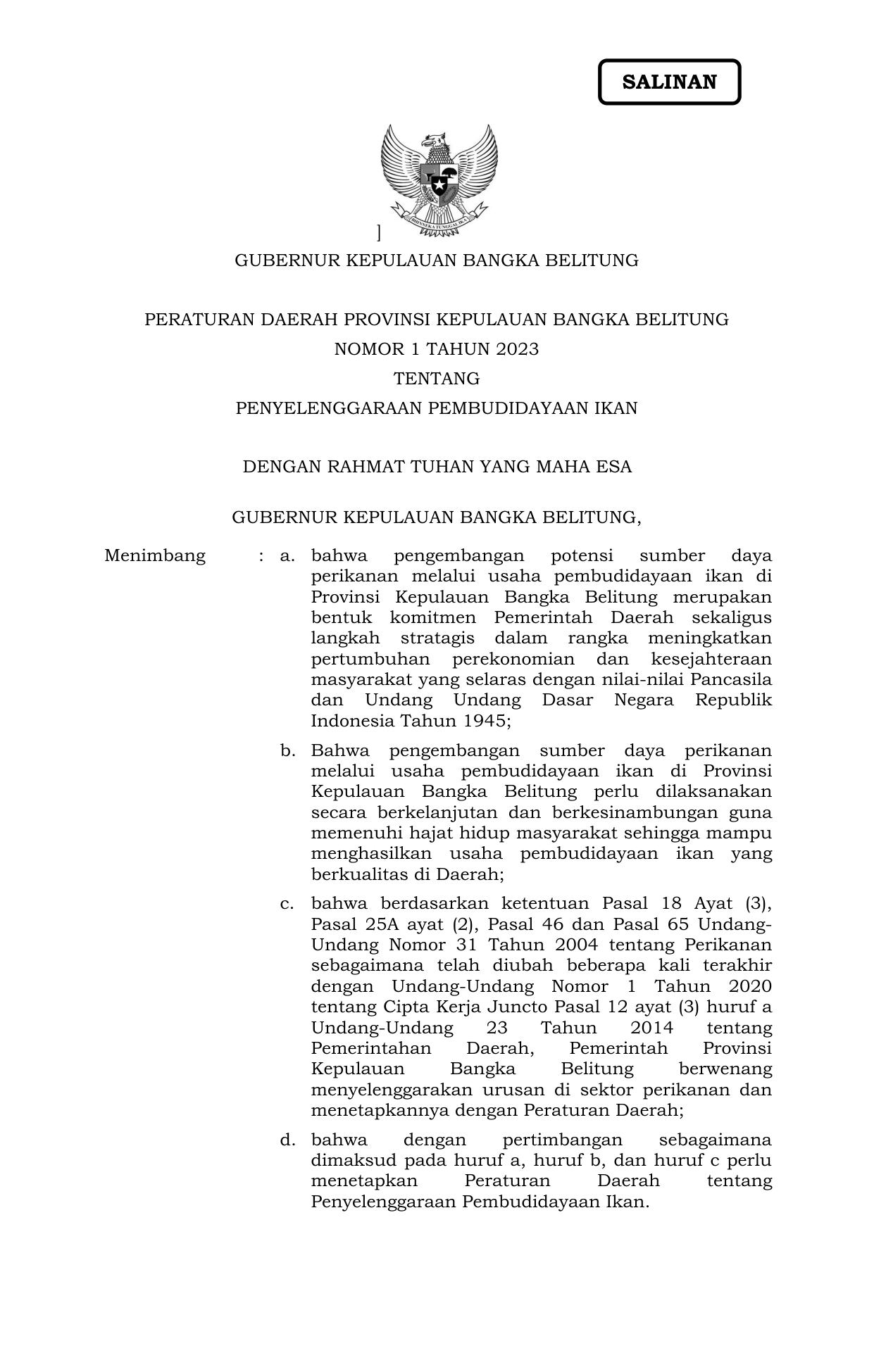 PERDA Nomor 1 Tahun 2023 | Peraturan Daerah Nomor 1 Tahun 2023 tentang PENYELENGGARAAN PEMBUDIDAYAAN IKAN