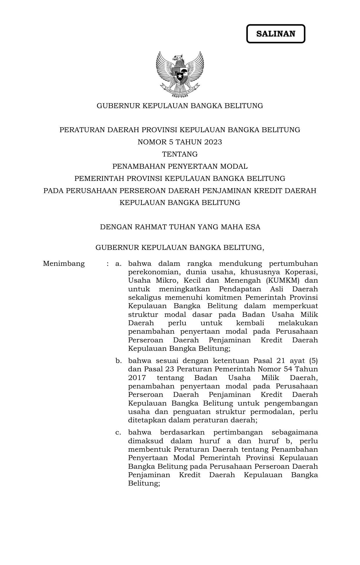 PERDA Nomor 5 Tahun 2023 | Peraturan Daerah Nomor 5 Tahun 2023 tentang PENAMBAHAN PENYERTAAN MODAL PEMERINTAH PROVINSI KEPULAUAN BANGKA BELITUNG PADA PERUSAHAAN PERSEROAN DAERAH PENJAMINAN KREDIT DAERAH KEPULAUAN BANGKA BELITUNG