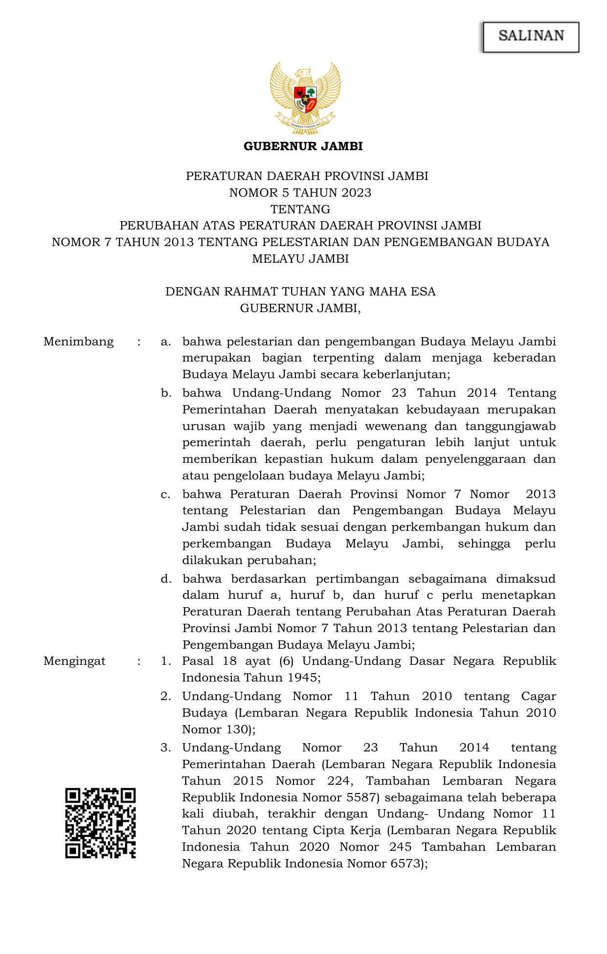 PERDA Nomor 5 Tahun 2023 | Peraturan Daerah Nomor 5 Tahun 2023 tentang PERUBAHAN ATAS PERATURAN DAERAH PROVINSI JAMBI NOMOR 7 TAHUN 2013 TENTANG PELESTARIAN DAN PENGEMBANGAN BUDAYA MELAYU JAMBI