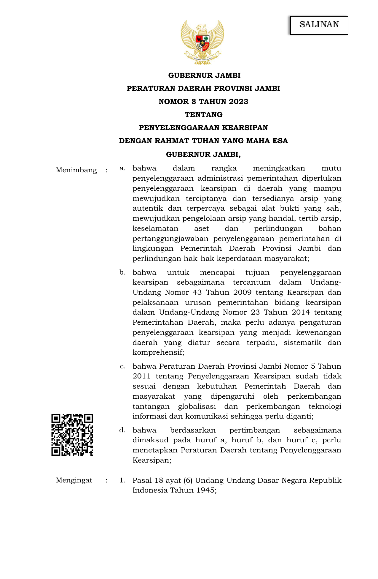 PERDA Nomor 8 Tahun 2023 | Peraturan Daerah Nomor 8 Tahun 2023 tentang PENYELENGGARAAN KEARSIPAN