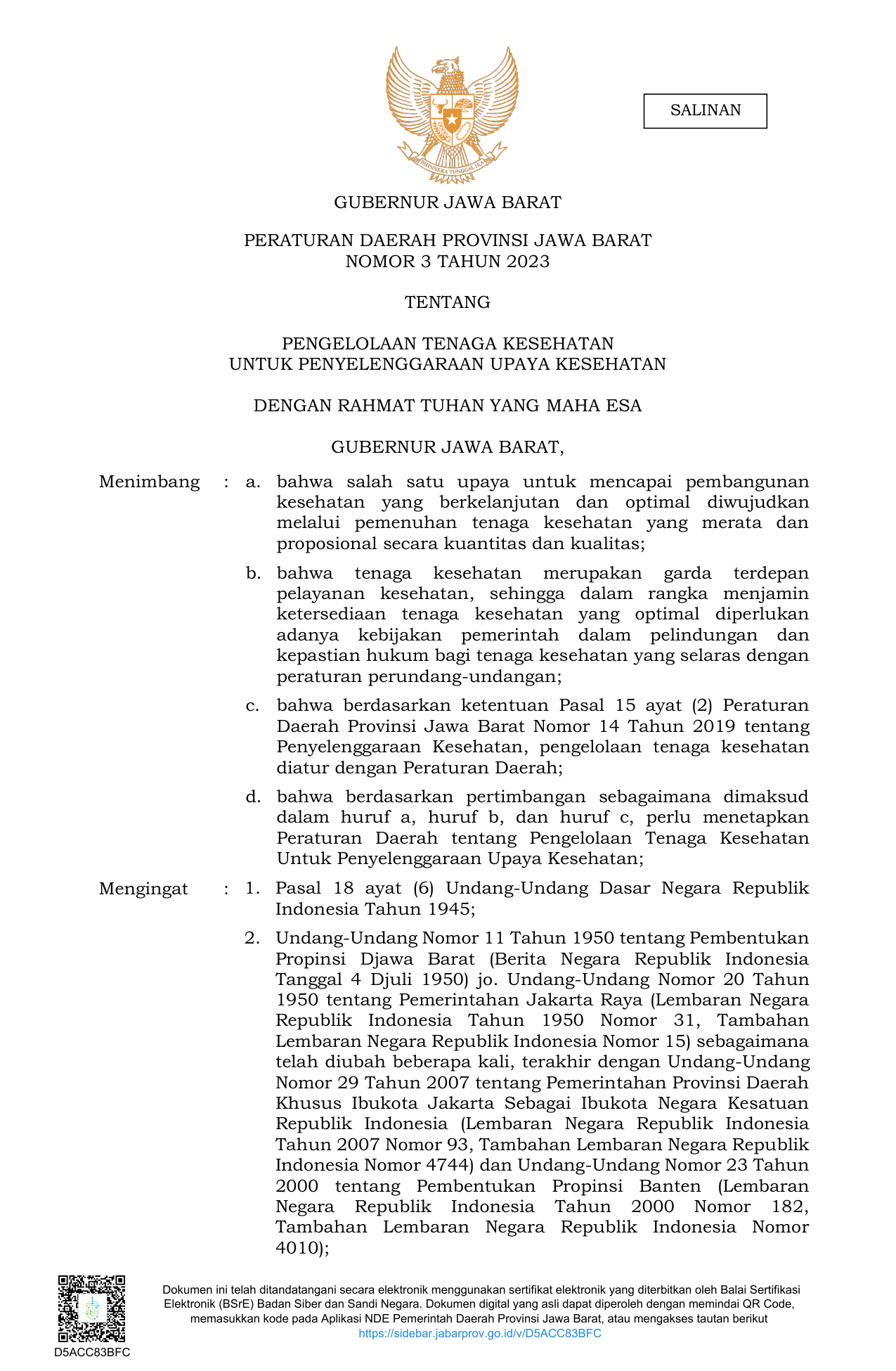 Dokumen ini telah ditandatangani secara elektronik menggunakan sertifikat elektronik yang diterbitkan oleh Balai Sertifikasi Elektronik (BSrE) Badan Siber dan Sandi Negara. Dokumen digital yang asli dapat diperoleh dengan memindai QR Code, memasukkan kode pada Aplikasi NDE Pemerintah Daerah Provinsi Jawa Barat, atau mengakses tautan berikut https://sidebar.jabarprov.go.id/v/D5ACC83BFC D5ACC83BFC