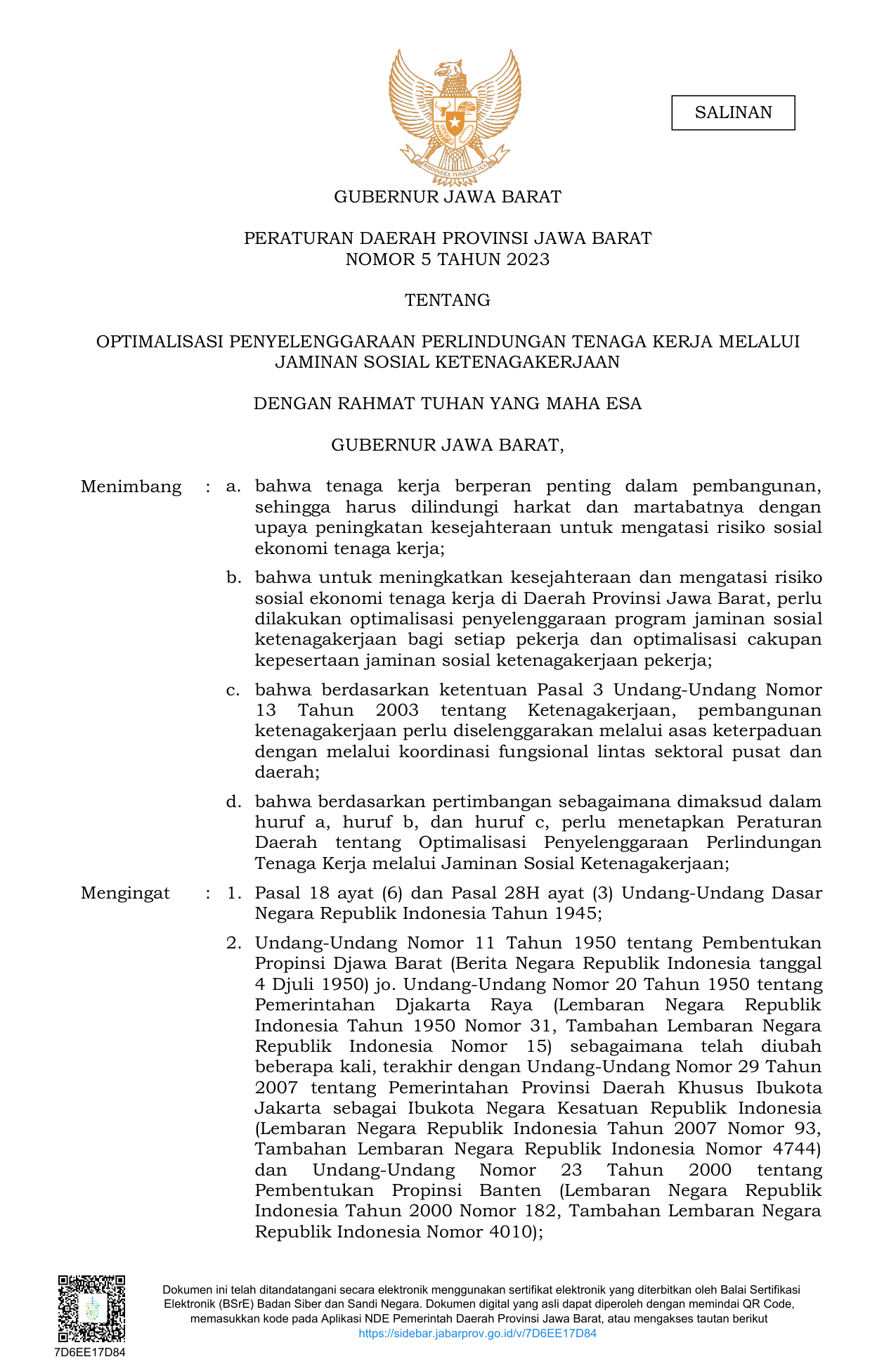 Dokumen ini telah ditandatangani secara elektronik menggunakan sertifikat elektronik yang diterbitkan oleh Balai Sertifikasi Elektronik (BSrE) Badan Siber dan Sandi Negara. Dokumen digital yang asli dapat diperoleh dengan memindai QR Code, memasukkan kode pada Aplikasi NDE Pemerintah Daerah Provinsi Jawa Barat, atau mengakses tautan berikut https://sidebar.jabarprov.go.id/v/7D6EE17D84 7D6EE17D84