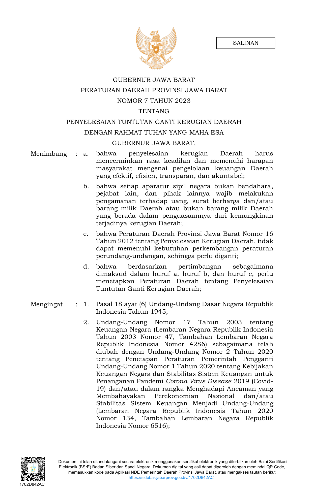Dokumen ini telah ditandatangani secara elektronik menggunakan sertifikat elektronik yang diterbitkan oleh Balai Sertifikasi Elektronik (BSrE) Badan Siber dan Sandi Negara. Dokumen digital yang asli dapat diperoleh dengan memindai QR Code, memasukkan kode pada Aplikasi NDE Pemerintah Daerah Provinsi Jawa Barat, atau mengakses tautan berikut https://sidebar.jabarprov.go.id/v/1702D842AC 1702D842AC